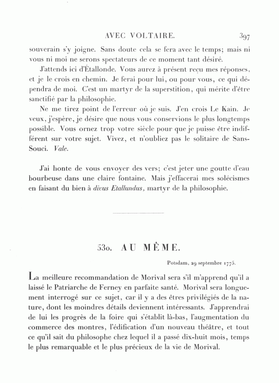 J'attends ici d'Étallonde. Vous aurez à présent reçu mes réponses, et je le crois en chemin. Je ferai pour lui, ou pour vous, ce qui dépendra de moi. C'est un martyr de la superstition, qui mérite d'être sanctifié par la philosophie.
