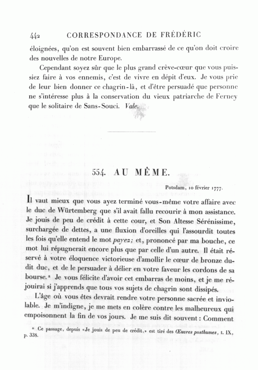 Cependant soyez sûr que le plus grand crève-cœur que vous puissiez faire à vos ennemis, c'est de vivre en dépit d'eux. Je vous prie de leur bien donner ce chagrin-là, et d'être persuadé que personne ne s'intéresse plus à la conservation du vieux patriarche de Ferney que le solitaire de Sans-Souci. Vale.