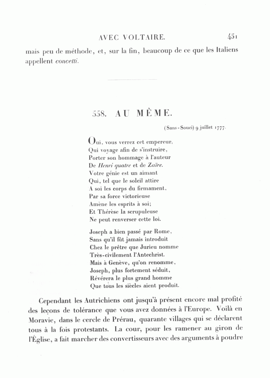 Cependant les Autrichiens ont jusqu'à présent encore mal profité des leçons de tolérance que vous avez données à l'Europe. Voilà en Moravie, dans le cercle de Prérau, quarante villages qui se déclarent tous à la fois protestants. La cour, pour les ramener au giron de l'Église, a fait marcher des convertisseurs avec des arguments à poudre