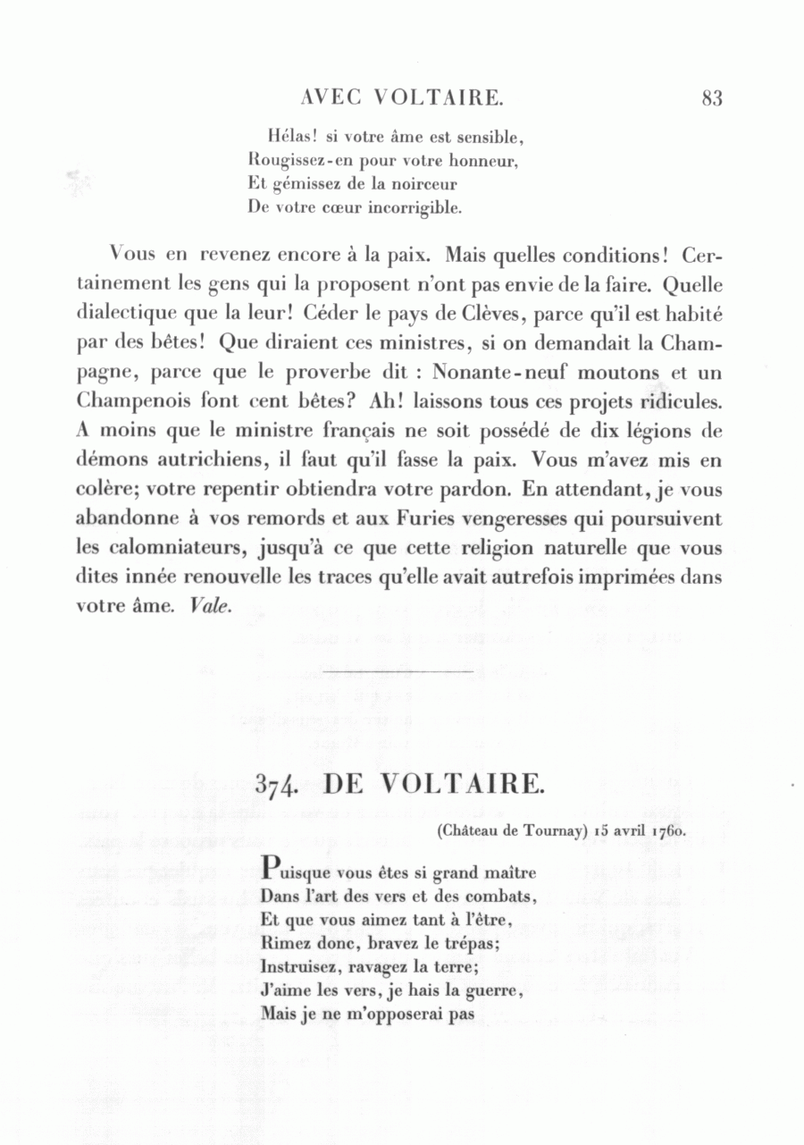 Vous en revenez encore à la paix. Mais quelles conditions! Certainement les gens qui la proposent n'ont pas envie de la faire. Quelle dialectique que la leur! Céder le pays de Clèves, parce qu'il est habité par des bêtes! Que diraient ces ministres, si on demandait la Champagne, parce que le proverbe dit : Nonante-neuf moutons et un Champenois font cent bêtes? Ah! laissons tous ces projets ridicules. A moins que le ministre français ne soit possédé de dix légions de démons autrichiens, il faut qu'il fasse la paix. Vous m'avez mis en colère; votre repentir obtiendra votre pardon. En attendant, je vous abandonne à vos remords et aux Furies vengeresses qui poursuivent les calomniateurs, jusqu'à ce que cette religion naturelle que vous dites innée renouvelle les traces qu'elle avait autrefois imprimées dans votre âme. Vale.