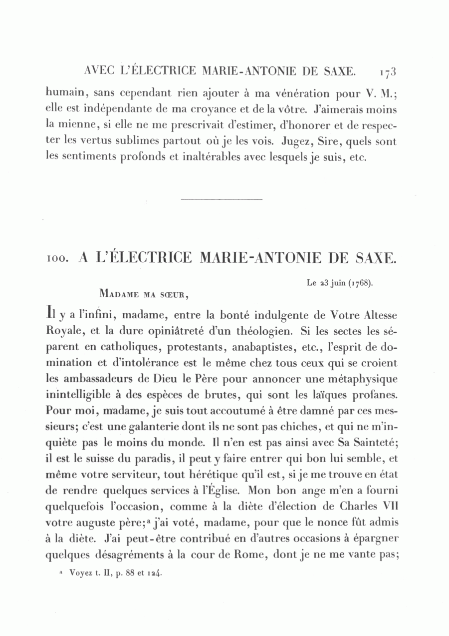 Il y a l'infini, madame, entre la bonté indulgente de Votre Altesse Royale, et la dure opiniâtreté d'un théologien. Si les sectes les séparent en catholiques, protestants, anabaptistes, etc., l'esprit de domination et d'intolérance est le même chez tous ceux qui se croient les ambassadeurs de Dieu le Père pour annoncer une métaphysique inintelligible à des espèces de brutes, qui sont les laïques profanes. Pour moi, madame, je suis tout accoutumé à être damné par ces messieurs; c'est une galanterie dont ils ne sont pas chiches, et qui ne m'inquiète pas le moins du monde. Il n'en est pas ainsi avec Sa Sainteté; il est le suisse du paradis, il peut y faire entrer qui bon lui semble, et même votre serviteur, tout hérétique qu'il est, si je me trouve en état de rendre quelques services à l'Église. Mon bon ange m'en a fourni quelquefois l'occasion, comme à la diète d'élection de Charles VII votre auguste père;a j'ai voté, madame, pour que le nonce fût admis à la diète. J'ai peut-être contribué en d'autres occasions à épargner quelques désagréments à la cour de Rome, dont je ne me vante pas;