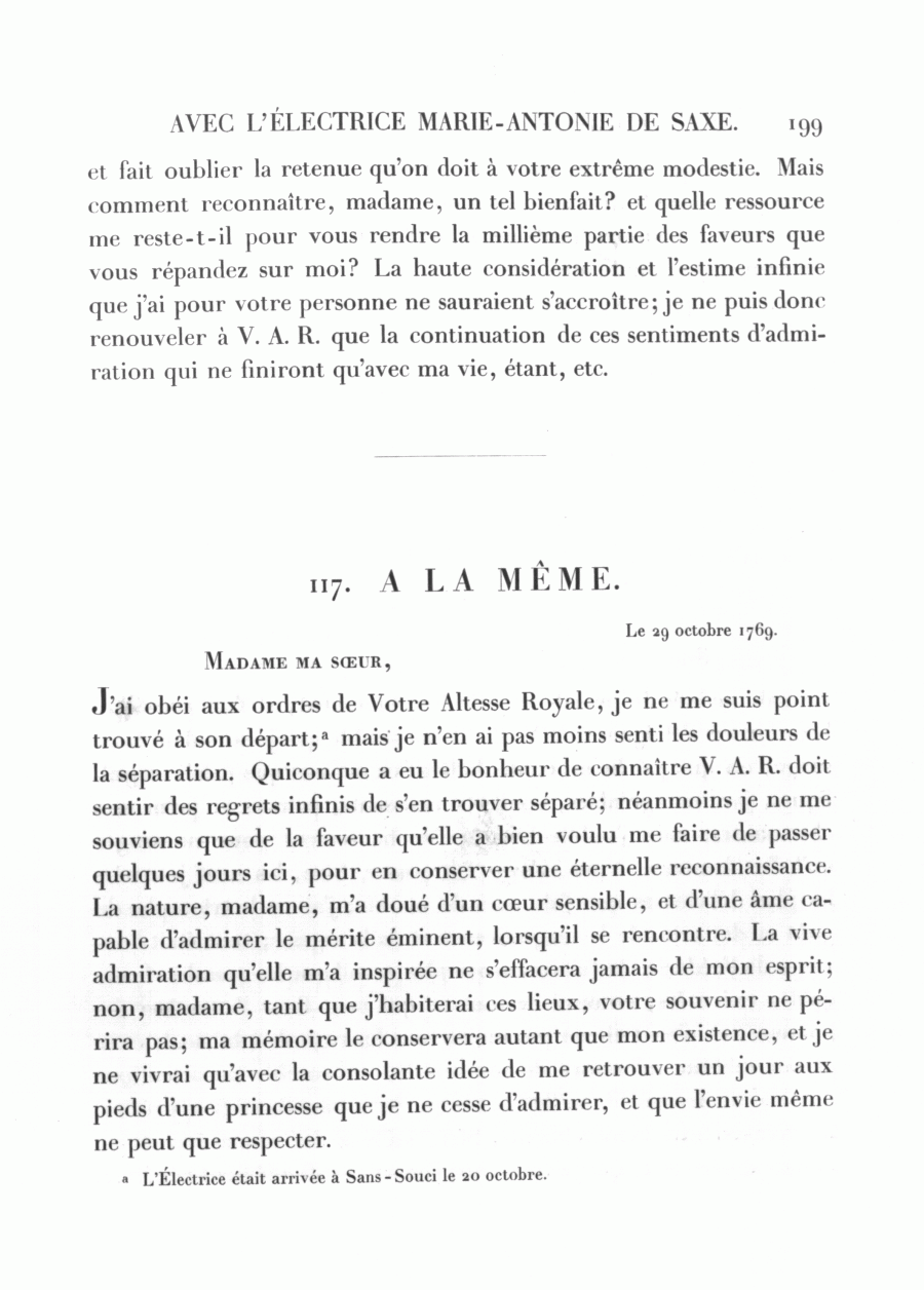 <199> et fait oublier la retenue qu'on doit à votre extrême modestie. Mais comment reconnaître, madame, un tel bienfait? et quelle ressource me reste-t-il pour vous rendre la millième partie des faveurs que vous répandez sur moi? La haute considération et l'estime infinie que j'ai pour votre personne ne sauraient s'accroître; je ne puis donc renouveler à V. A. R. que la continuation de ces sentiments d'admiration qui ne finiront qu'avec ma vie, étant, etc.