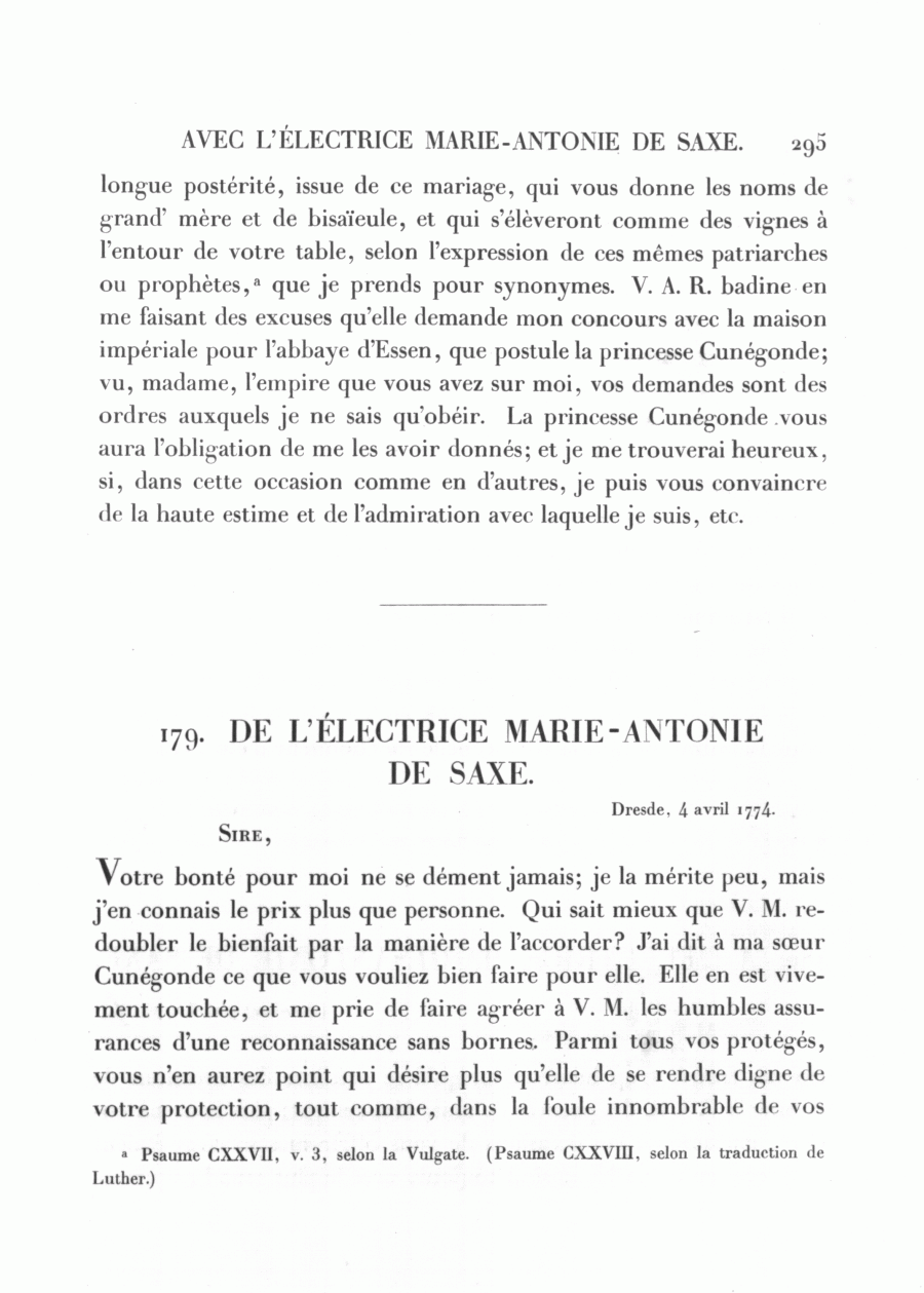 <295> longue postérité, issue de ce mariage, qui vous donne les noms de grand' mère et de bisaïeule, et qui s'élèveront comme des vignes à l'entour de votre table, selon l'expression de ces mêmes patriarches ou prophètes,a que je prends pour synonymes. V. A. R. badine en me faisant des excuses qu'elle demande mon concours avec la maison impériale pour l'abbaye d'Essen, que postule la princesse Cunégonde; vu, madame, l'empire que vous avez sur moi, vos demandes sont des ordres auxquels je ne sais qu'obéir. La princesse Cunégonde vous aura l'obligation de me les avoir donnés; et je me trouverai heureux, si, dans cette occasion comme en d'autres, je puis vous convaincre de la haute estime et de l'admiration avec laquelle je suis, etc.