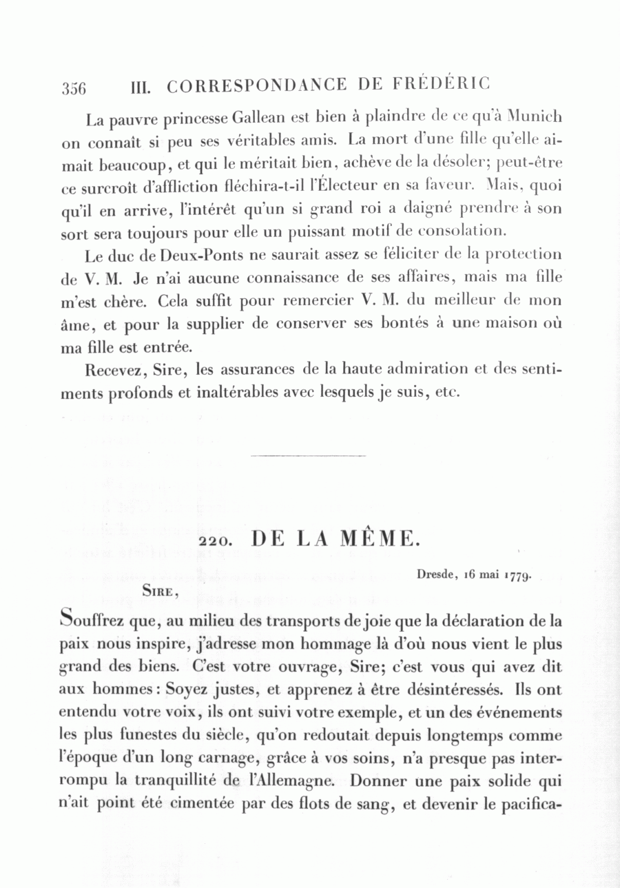 <356>La pauvre princesse Gallean est bien à plaindre de ce qu'à Munich on connaît si peu ses véritables amis. La mort d'une fille qu'elle aimait beaucoup, et qui le méritait bien, achève de la désoler; peut-être ce surcroît d'affliction fléchira-t-il l'Électeur en sa faveur. Mais, quoi qu'il en arrive, l'intérêt qu'un si grand roi a daigné prendre à son sort sera toujours pour elle un puissant motif de consolation.
