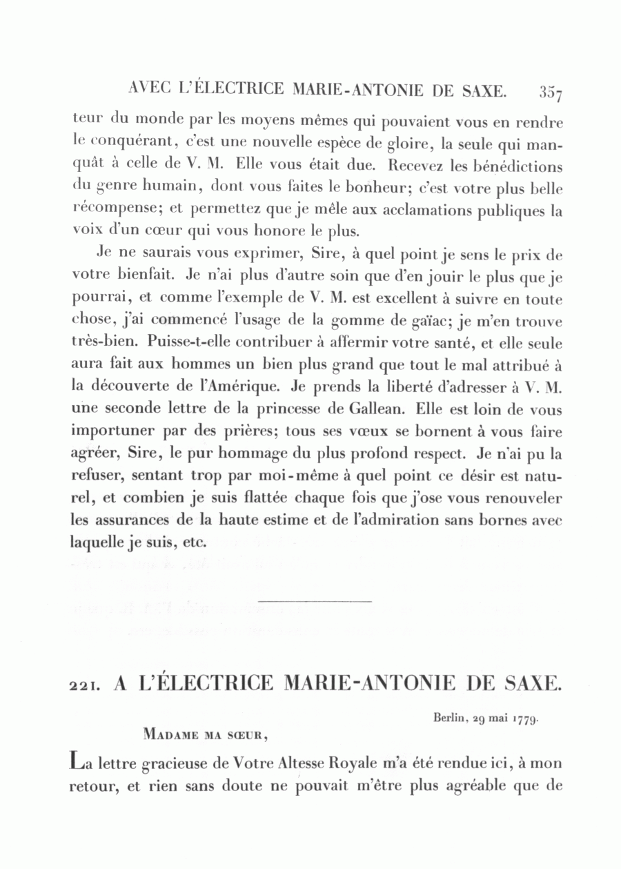 Je ne saurais vous exprimer, Sire, à quel point je sens le prix de votre bienfait. Je n'ai plus d'autre soin que d'en jouir le plus que je pourrai, et comme l'exemple de V. M. est excellent à suivre en toute chose, j'ai commencé l'usage de la gomme de gaïac; je m'en trouve très-bien. Puisse-t-elle contribuer à affermir votre santé, et elle seule aura fait aux hommes un bien plus grand que tout le mal attribué à la découverte de l'Amérique. Je prends la liberté d'adresser à V. M. une seconde lettre de la princesse de Gallean. Elle est loin de vous importuner par des prières; tous ses vœux se bornent à vous faire agréer, Sire, le pur hommage du plus profond respect. Je n'ai pu la refuser, sentant trop par moi-même à quel point ce désir est naturel, et combien je suis flattée chaque fois que j'ose vous renouveler les assurances de la haute estime et de l'admiration sans bornes avec laquelle je suis, etc.