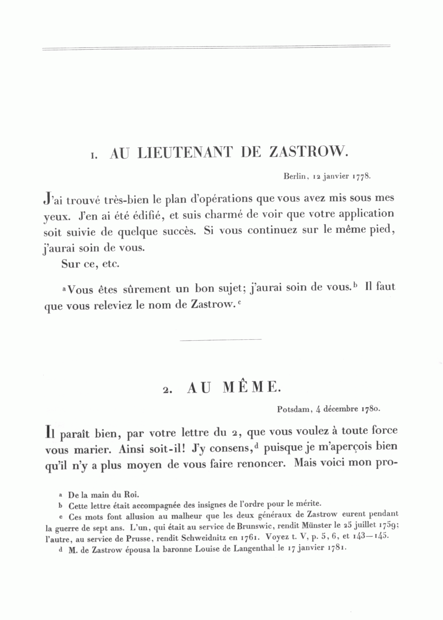 c Ces mots font allusion au malheur que les deux généraux de Zastrow eurent pendant la guerre de sept ans. L'un, qui était au service de Brunswic, rendit Münster le 25 juillet 1759; l'autre, au service de Prusse, rendit Schweidnitz en 1761. Voyez t. V, p. 5, 6, et 143-145.