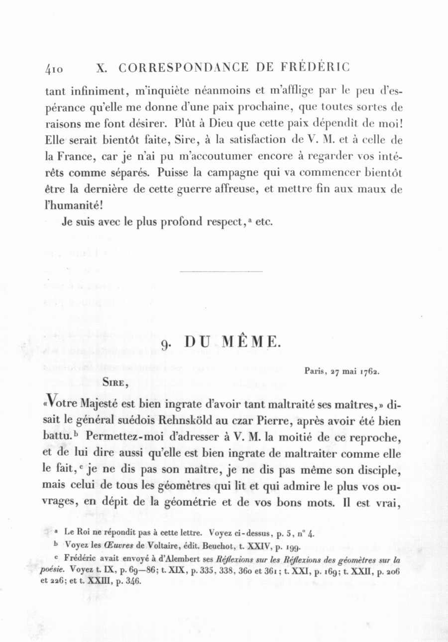 « Votre Majesté est bien ingrate d'avoir tant maltraité ses maîtres, » disait le général suédois Rehnsköld au czar Pierre, après avoir été bien battu.b Permettez-moi d'adresser à V. M. la moitié de ce reproche, et de lui dire aussi qu'elle est bien ingrate de maltraiter comme elle le fait,c je ne dis pas son maître, je ne dis pas même son disciple, mais celui de tous les géomètres qui lit et qui admire le plus vos ouvrages, en dépit de la géométrie et de vos bons mots. Il est vrai,