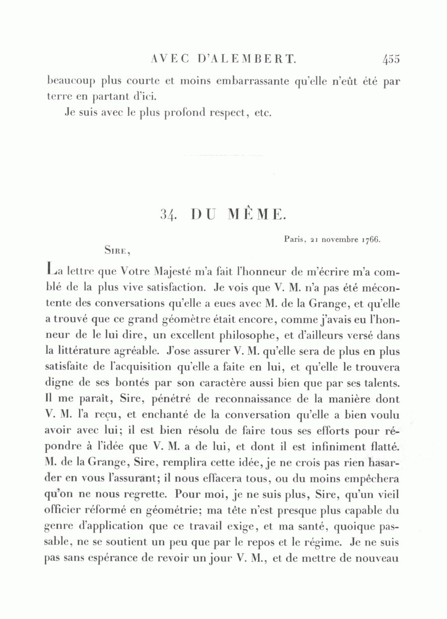 La lettre que Votre Majesté m'a fait l'honneur de m'écrire m'a comblé de la plus vive satisfaction. Je vois que V. M. n'a pas été mécontente des conversations qu'elle a eues avec M. de la Grange, et qu'elle a trouvé que ce grand géomètre était encore, comme j'avais eu l'honneur de le lui dire, un excellent philosophe, et d'ailleurs versé dans la littérature agréable. J'ose assurer V. M. qu'elle sera de plus en plus satisfaite de l'acquisition qu'elle a faite en lui, et qu'elle le trouvera digne de ses bontés par son caractère aussi bien que par ses talents. Il me paraît, Sire, pénétré de reconnaissance de la manière dont V. M. l'a reçu, et enchanté de la conversation qu'elle a bien voulu avoir avec lui; il est bien résolu de faire tous ses efforts pour répondre à l'idée que V. M. a de lui, et dont il est infiniment flatté. M. de la Grange, Sire, remplira cette idée, je ne crois pas rien hasarder en vous l'assurant; il nous effacera tous, ou du moins empêchera qu'on ne nous regrette. Pour moi, je ne suis plus, Sire, qu'un vieil officier réformé en géométrie; ma tête n'est presque plus capable du genre d'application que ce travail exige, et ma santé, quoique passable, ne se soutient un peu que par le repos et le régime. Je ne suis pas sans espérance de revoir un jour V. M., et de mettre de nouveau