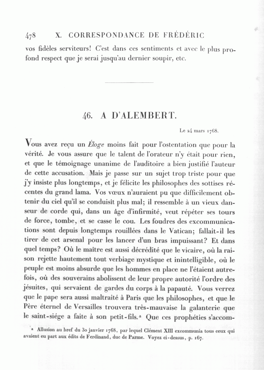 Vous avez reçu un Éloge moins fait pour l'ostentation que pour la vérité. Je vous assure que le talent de l'orateur n'y était pour rien, et que le témoignage unanime de l'auditoire a bien justifié l'auteur de cette accusation. Mais je passe sur un sujet trop triste pour que j'y insiste plus longtemps, et je félicite les philosophes des sottises récentes du grand lama. Vos vœux n'auraient pu que difficilement obtenir du ciel qu'il se conduisît plus mal; il ressemble à un vieux danseur de corde qui, dans un âge d'infirmité, veut répéter ses tours de force, tombe, et se casse le cou. Les foudres des excommunications sont depuis longtemps rouillées dans le Vatican; fallait-il les tirer de cet arsenal pour les lancer d'un bras impuissant? Et dans quel temps? Où le maître est aussi décrédité que le vicaire, où la raison rejette hautement tout verbiage mystique et inintelligible, où le peuple est moins absurde que les hommes en place ne l'étaient autrefois, où des souverains abolissent de leur propre autorité l'ordre des jésuites, qui servaient de gardes du corps à la papauté. Vous verrez que le pape sera aussi maltraité à Paris que les philosophes, et que le Père éternel de Versailles trouvera très-mauvaise la galanterie que le saint-siége a faite à son petit-fils.a Que ces prophéties s'accom-