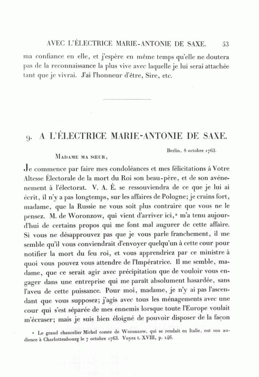 a Le grand chancelier Michel comte de Woronzow, qui se rendait en Italie, eut son audience à Charlottenbourg le 7 octobre 1763. Voyez t. XVIII, p. 146.