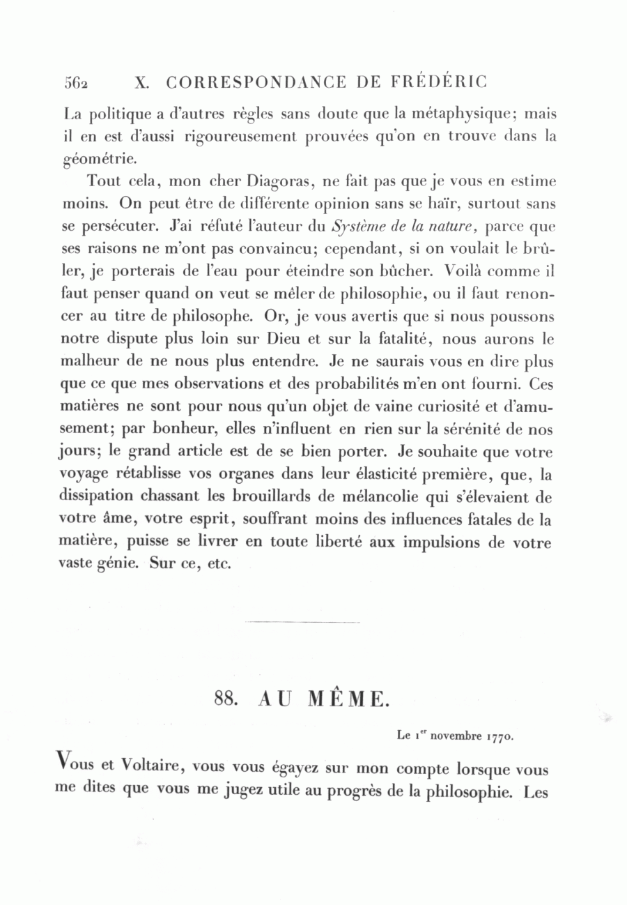 Tout cela, mon cher Diagoras, ne fait pas que je vous en estime moins. On peut être de différente opinion sans se haïr, surtout sans se persécuter. J'ai réfuté l'auteur du Système de la nature, parce que ses raisons ne m'ont pas convaincu; cependant, si on voulait le brûler, je porterais de l'eau pour éteindre son bûcher. Voilà comme il faut penser quand on veut se mêler de philosophie, ou il faut renoncer au titre de philosophe. Or, je vous avertis que si nous poussons notre dispute plus loin sur Dieu et sur la fatalité, nous aurons le malheur de ne nous plus entendre. Je ne saurais vous en dire plus que ce que mes observations et des probabilités m'en ont fourni. Ces matières ne sont pour nous qu'un objet de vaine curiosité et d'amusement; par bonheur, elles n'influent en rien sur la sérénité de nos jours; le grand article est de se bien porter. Je souhaite que votre voyage rétablisse vos organes dans leur élasticité première, que, la dissipation chassant les brouillards de mélancolie qui s'élevaient de votre âme, votre esprit, souffrant moins des influences fatales de la matière, puisse se livrer en toute liberté aux impulsions de votre vaste génie. Sur ce, etc.