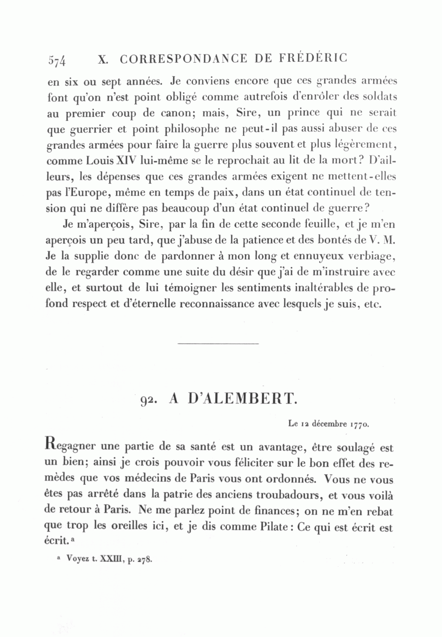 <574> en six ou sept années. Je conviens encore que ces grandes armées font qu'on n'est point obligé comme autrefois d'enrôler des soldats au premier coup de canon; mais, Sire, un prince qui ne serait que guerrier et point philosophe ne peut-il pas aussi abuser de ces grandes armées pour faire la guerre plus souvent et plus légèrement, comme Louis XIV lui-même se le reprochait au lit de la mort? D'ailleurs, les dépenses que ces grandes armées exigent ne mettent-elles pas l'Europe, même en temps de paix, dans un état continuel de tension qui ne diffère pas beaucoup d'un état continuel de guerre?