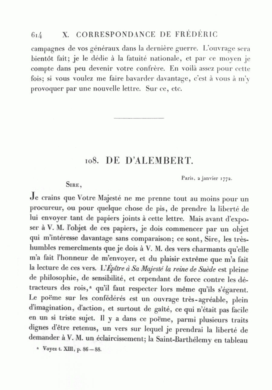 Je crains que Votre Majesté ne me prenne tout au moins pour un procureur, ou pour quelque chose de pis, de prendre la liberté de lui envoyer tant de papiers joints à cette lettre. Mais avant d'exposer à V. M. l'objet de ces papiers, je dois commencer par un objet qui m'intéresse davantage sans comparaison; ce sont, Sire, les très-humbles remercîments que je dois à V. M. des vers charmants qu'elle m'a fait l'honneur de m'envoyer, et du plaisir extrême que m'a fait la lecture de ces vers. L'Épître à Sa Majesté la reine de Suède est pleine de philosophie, de sensibilité, et cependant de force contre les détracteurs des rois,a qu'il faut respecter lors même qu'ils s'égarent. Le poëme sur les confédérés est un ouvrage très-agréable, plein d'imagination, d'action, et surtout de gaîté, ce qui n'était pas facile en un si triste sujet. Il y a dans ce poëme, parmi plusieurs traits dignes d'être retenus, un vers sur lequel je prendrai la liberté de demander à V. M. un éclaircissement; la Saint-Barthélemy en tableau