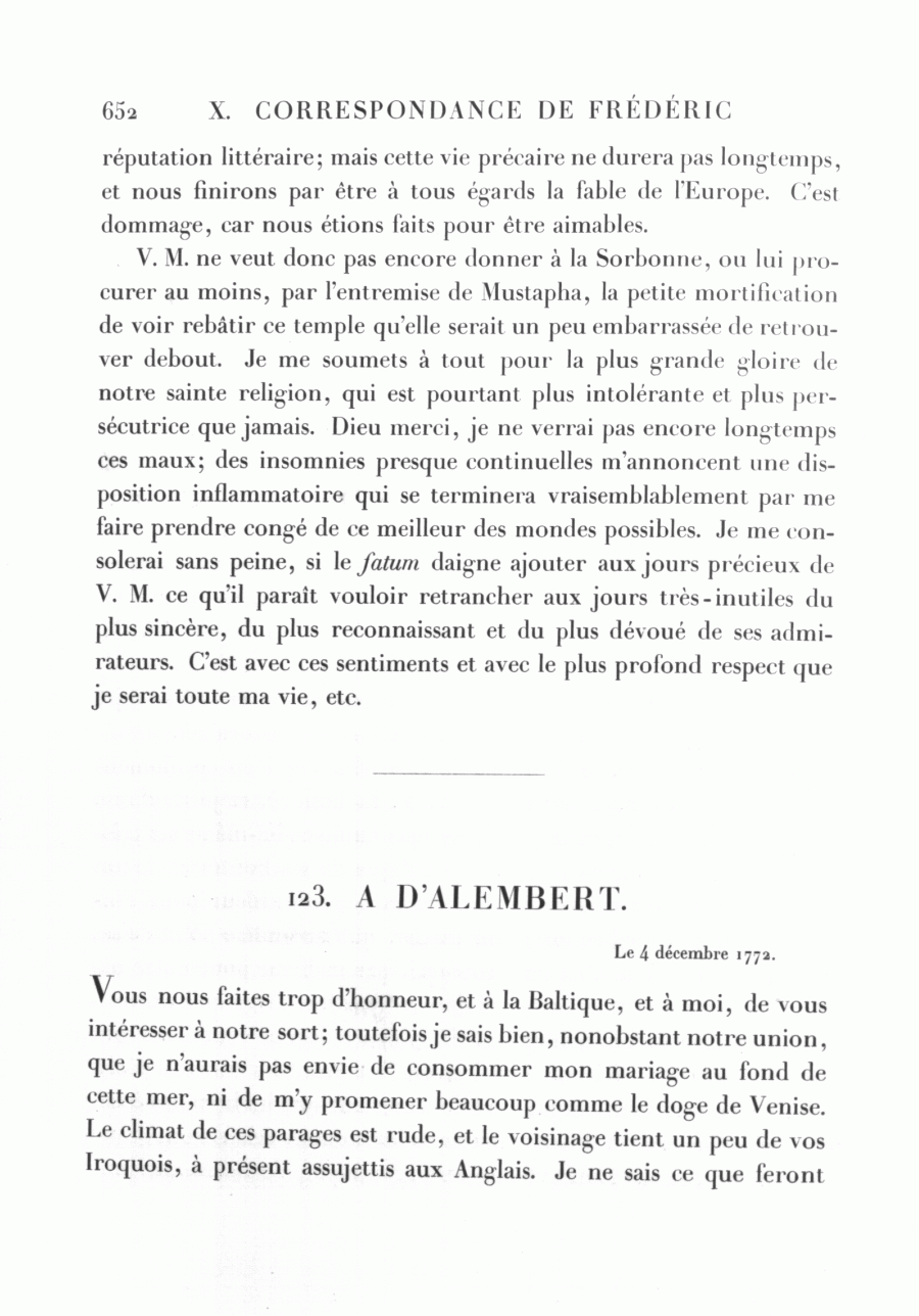 V. M. ne veut donc pas encore donner à la Sorbonne, ou lui procurer au moins, par l'entremise de Mustapha, la petite mortification de voir rebâtir ce temple qu'elle serait un peu embarrassée de retrouver debout. Je me soumets à tout pour la plus grande gloire de notre sainte religion, qui est pourtant plus intolérante et plus persécutrice que jamais. Dieu merci, je ne verrai pas encore longtemps ces maux; des insomnies presque continuelles m'annoncent une disposition inflammatoire qui se terminera vraisemblablement par me faire prendre congé de ce meilleur des mondes possibles. Je me consolerai sans peine, si le fatum daigne ajouter aux jours précieux de V. M. ce qu'il paraît vouloir retrancher aux jours très-inutiles du plus sincère, du plus reconnaissant et du plus dévoué de ses admirateurs. C'est avec ces sentiments et avec le plus profond respect que je serai toute ma vie, etc.