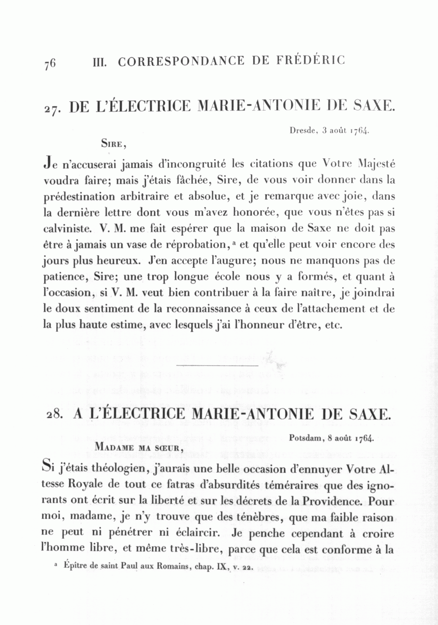 Je n'accuserai jamais d'incongruité les citations que Votre Majesté voudra faire; mais j'étais fâchée, Sire, de vous voir donner dans la prédestination arbitraire et absolue, et je remarque avec joie, dans la dernière lettre dont vous m'avez honorée, que vous n'êtes pas si calviniste. V. M. me fait espérer que la maison de Saxe ne doit pas être à jamais un vase de réprobation,a et qu'elle peut voir encore des jours plus heureux. J'en accepte l'augure; nous ne manquons pas de patience, Sire; une trop longue école nous y a formés, et quant à l'occasion, si V. M. veut bien contribuer à la faire naître, je joindrai le doux sentiment de la reconnaissance à ceux de l'attachement et de la plus haute estime, avec lesquels j'ai l'honneur d'être, etc.