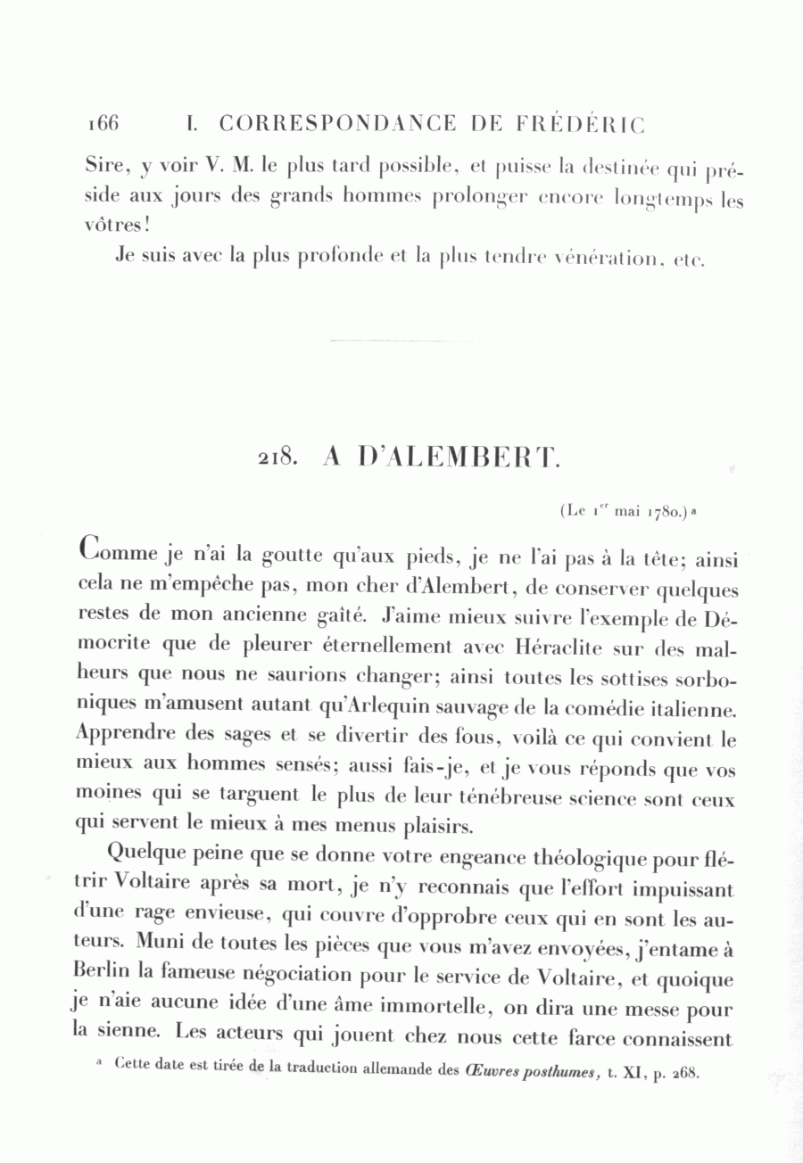 Comme je n'ai la goutte qu'aux pieds, je ne l'ai pas à la tête; ainsi cela ne m'empêche pas, mon cher d'Alembert, de conserver quelques restes de mon ancienne gaîté. J'aime mieux suivre l'exemple de Démocrite que de pleurer éternellement avec Heraclite sur des malheurs que nous ne saurions changer; ainsi toutes les sottises sorboniques m'amusent autant qu'Arlequin sauvage de la comédie italienne. Apprendre des sages et se divertir des fous, voilà ce qui convient le mieux aux hommes sensés; aussi fais-je, et je vous réponds que vos moines qui se targuent le plus de leur ténébreuse science sont ceux qui servent le mieux à mes menus plaisirs.