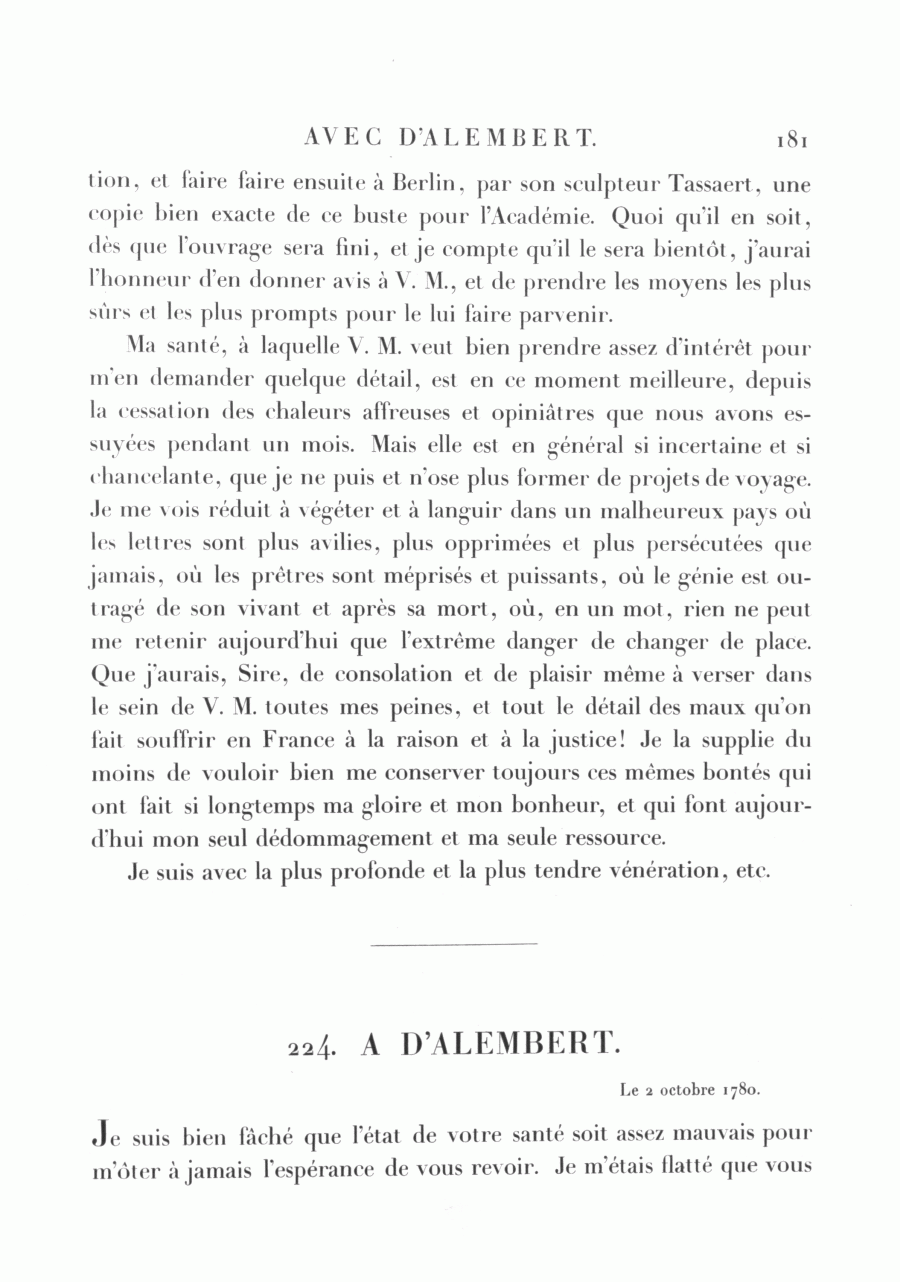 Ma santé, à laquelle V. M. veut bien prendre assez d'intérêt pour m'en demander quelque détail, est en ce moment meilleure, depuis la cessation des chaleurs affreuses et opiniâtres que nous avons essuyées pendant un mois. Mais elle est en général si incertaine et si chancelante, que je ne puis et n'ose plus former de projets de voyage. Je me vois réduit à végéter et à languir dans un malheureux pays où les lettres sont plus avilies, plus opprimées et plus persécutées que jamais, où les prêtres sont méprisés et puissants, où le génie est outragé de son vivant et après sa mort, où, en un mot, rien ne peut me retenir aujourd'hui que l'extrême danger de changer de place. Que j'aurais, Sire, de consolation et de plaisir même à verser dans le sein de V. M. toutes mes peines, et tout le détail des maux qu'on fait souffrir en France à la raison et à la justice! Je la supplie du moins de vouloir bien me conserver toujours ces mêmes bontés qui ont fait si longtemps ma gloire et mon bonheur, et qui font aujourd'hui mon seul dédommagement et ma seule ressource.