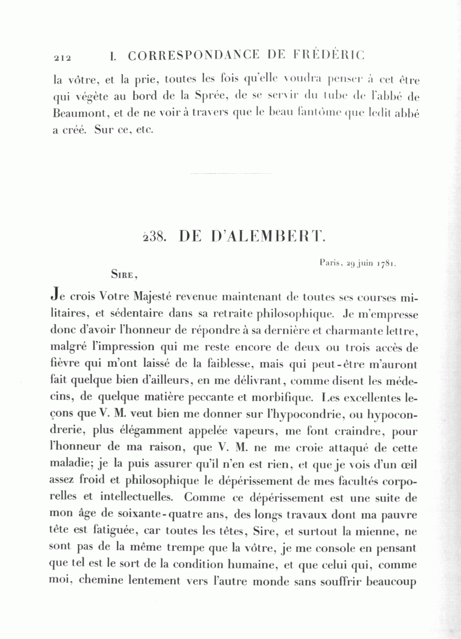 Je crois Votre Majesté revenue maintenant de toutes ses courses militaires, et sédentaire dans sa retraite philosophique. Je m'empresse donc d'avoir l'honneur de répondre à sa dernière et charmante lettre, malgré l'impression qui me reste encore de deux ou trois accès de fièvre qui m'ont laissé de la faiblesse, mais qui peut-être m'auront fait quelque bien d'ailleurs, en me délivrant, comme disent les médecins, de quelque matière peccante et morbifique. Les excellentes leçons que V. M. veut bien me donner sur l'hypocondrie, ou hypocondrerie, plus élégamment appelée vapeurs, me font craindre, pour l'honneur de ma raison, que V. M. ne me croie attaqué de cette maladie; je la puis assurer qu'il n'en est rien, et que je vois d'un œil assez froid et philosophique le dépérissement de mes facultés corporelles et intellectuelles. Comme ce dépérissement est une suite de mon âge de soixante-quatre ans, des longs travaux dont ma pauvre tête est fatiguée, car toutes les têtes, Sire, et surtout la mienne, ne sont pas de la même trempe que la vôtre, je me console en pensant que tel est le sort de la condition humaine, et que celui qui, comme moi, chemine lentement vers l'autre monde sans souffrir beaucoup