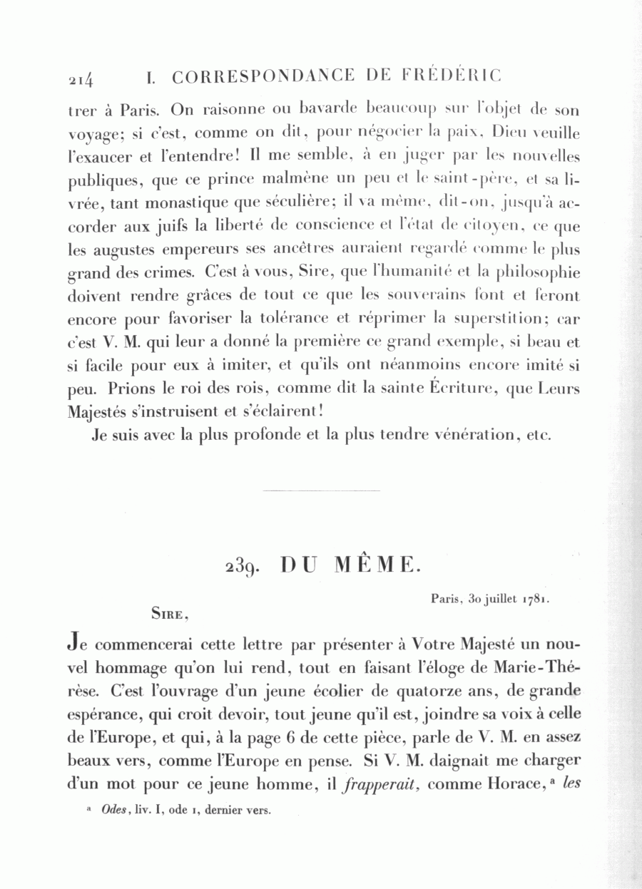 Je commencerai cette lettre par présenter à Votre Majesté un nouvel hommage qu'on lui rend, tout en faisant l'éloge de Marie-Thérèse. C'est l'ouvrage d'un jeune écolier de quatorze ans, de grande espérance, qui croit devoir, tout jeune qu'il est, joindre sa voix à celle de l'Europe, et qui, à la page 6 de cette pièce, parle de V. M. en assez beaux vers, comme l'Europe en pense. Si V. M. daignait me charger d'un mot pour ce jeune homme, il frapperait, comme Horace,a les