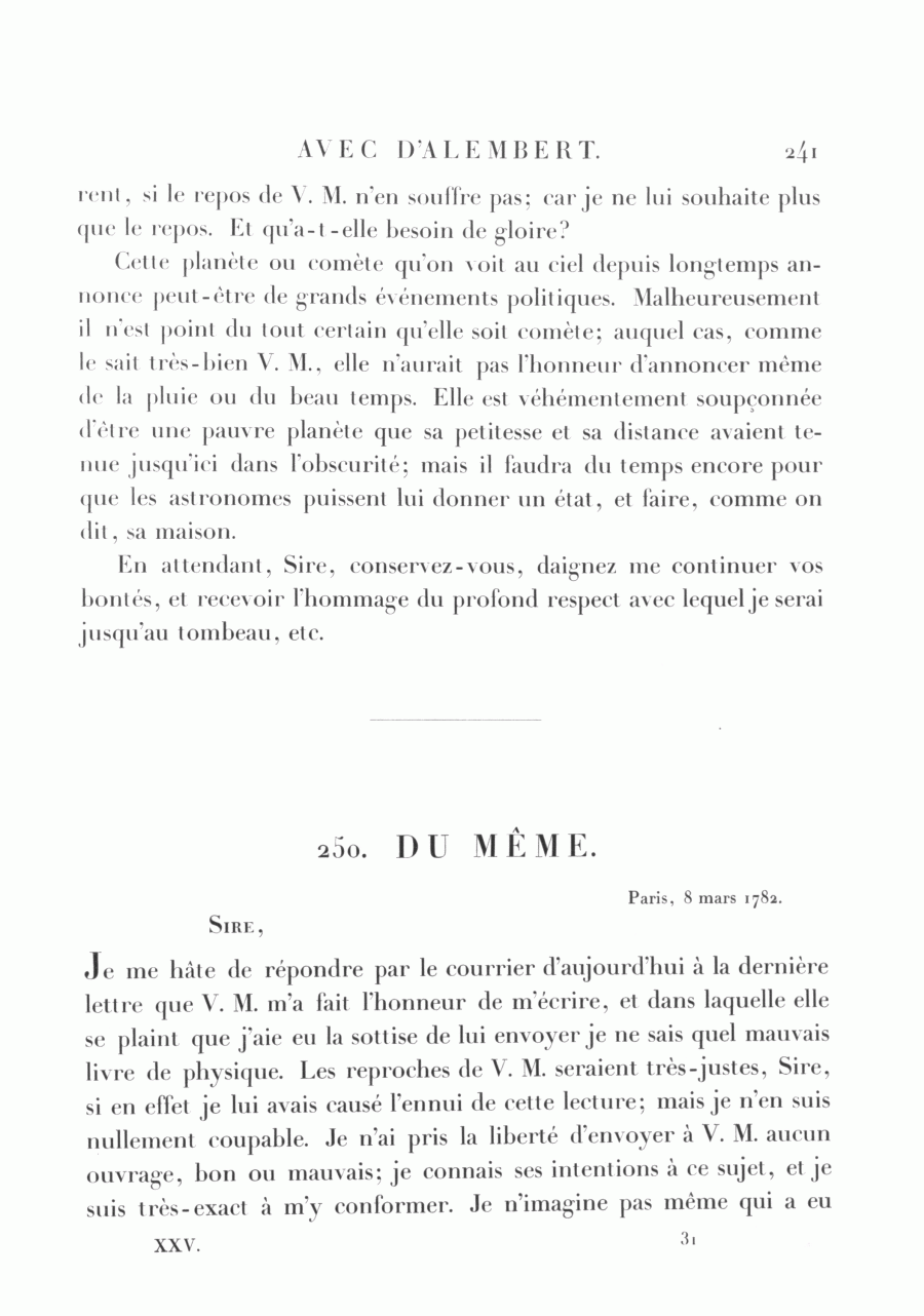 Cette planète ou comète qu'on voit au ciel depuis longtemps annonce peut-être de grands événements politiques. Malheureusement il n'est point du tout certain qu'elle soit comète; auquel cas, comme le sait très-bien V. M., elle n'aurait pas l'honneur d'annoncer même de la pluie ou du beau temps. Elle est véhémentement soupçonnée d'être une pauvre planète que sa petitesse et sa distance avaient tenue jusqu'ici dans l'obscurité; mais il faudra du temps encore pour que les astronomes puissent lui donner un état, et faire, comme on dit, sa maison.