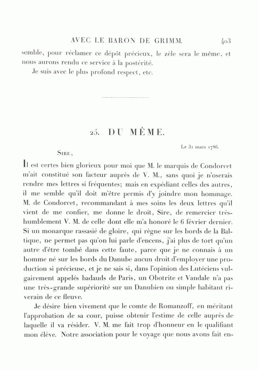Il est certes bien glorieux pour moi que M. le marquis de Condorcet m'ait constitué son facteur auprès de V. M., sans quoi je n'oserais rendre mes lettres si fréquentes; mais en expédiant celles des autres, il me semble qu'il doit m'être permis d'y joindre mon hommage. M. de Condorcet, recommandant à mes soins les deux lettres qu'il vient de me confier, me donne le droit, Sire, de remercier très-humblement V. M. de celle dont elle m'a honoré le 6 février dernier. Si un monarque rassasié de gloire, qui règne sur les bords de la Baltique, ne permet pas qu'on lui parle d'encens, j'ai plus de tort qu'un autre d'être tombé dans cette faute, parce que je ne connais à un homme né sur les bords du Danube aucun droit d'employer une production si précieuse, et je ne sais si, dans l'opinion des Lutéciens vulgairement appelés badauds de Paris, un Obotrite et Vandale n'a pas une très-grande supériorité sur un Danubien ou simple habitant riverain de ce fleuve.