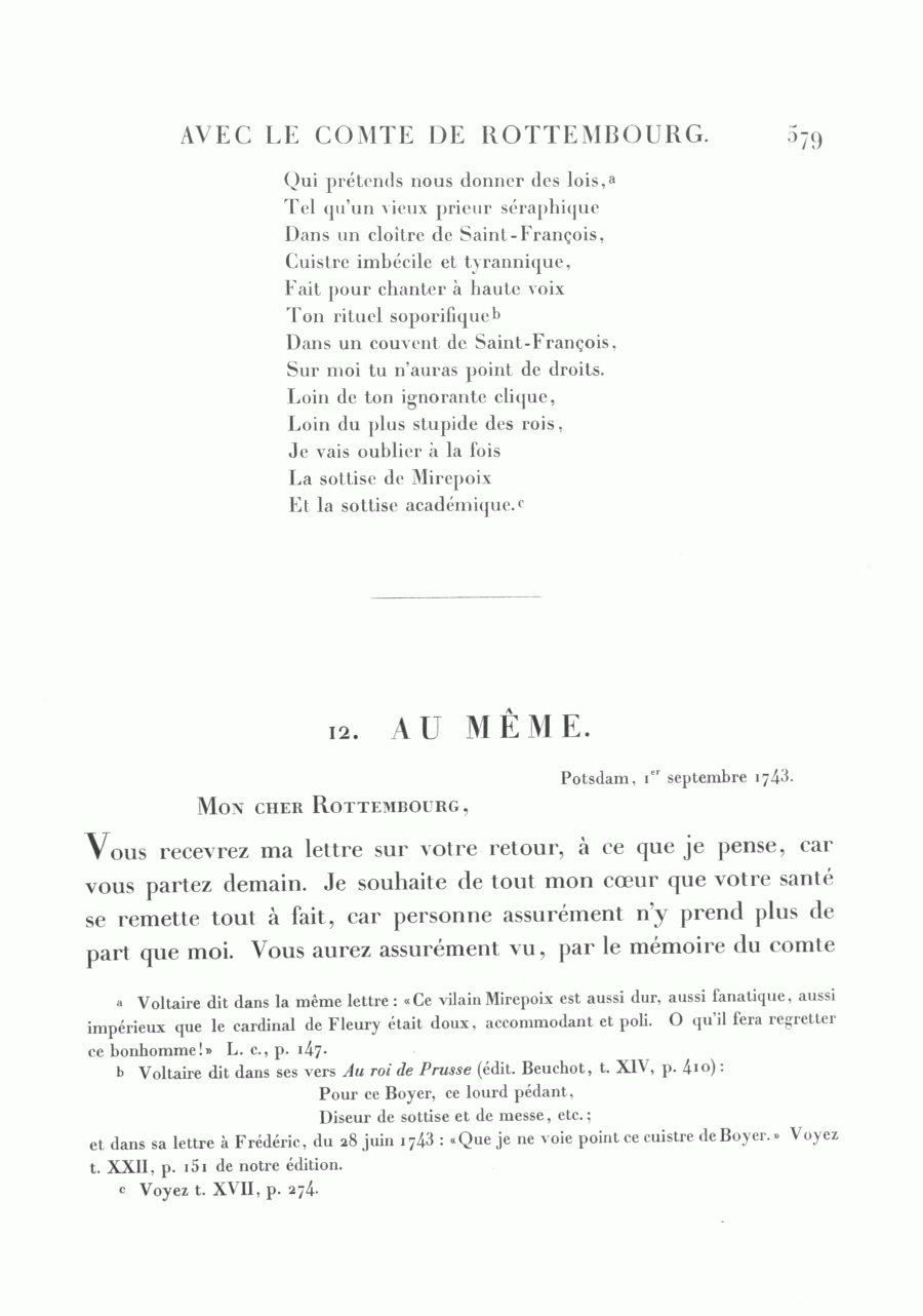 a Voltaire dit dans la même lettre : « Ce vilain Mirepoix est aussi dur, aussi fanatique, aussi impérieux que le cardinal de Fleury était doux, accommodant et poli. O qu'il fera regretter ce bonhomme! » L. c., p. 147.