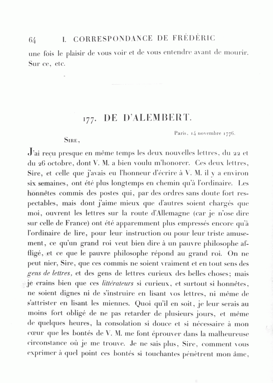J'ai reçu presque en même temps les deux nouvelles lettres, du 22 et du 26 octobre, dont V. M. a bien voulu m'honorer. Ces deux lettres, Sire, et celle que j'avais eu l'honneur d'écrire à V. M. il y a environ six semaines, ont été plus longtemps en chemin qu'à l'ordinaire. Les honnêtes commis des postes qui, par des ordres sans doute fort respectables, mais dont j'aime mieux que d'autres soient chargés que moi, ouvrent les lettres sur la route d'Allemagne (car je n'ose dire sur celle de France) ont été apparemment plus empressés encore qu'à l'ordinaire de lire, pour leur instruction ou pour leur triste amusement, ce qu'un grand roi veut bien dire à un pauvre philosophe affligé, et ce que le pauvre philosophe répond au grand roi. On ne peut nier, Sire, que ces commis ne soient vraiment et en tout sens des gens de lettres, et des gens de lettres curieux des belles choses; mais je crains bien que ces littérateurs si curieux, et surtout si honnêtes, ne soient dignes ni de s'instruire en lisant vos lettres, ni même de s'attrister en lisant les miennes. Quoi qu'il en soit, je leur serais au moins fort obligé de ne pas retarder de plusieurs jours, et même de quelques heures, la consolation si douce et si nécessaire à mon cœur que les bontés de V. M. me font éprouver dans la malheureuse circonstance où je me trouve. Je ne sais plus, Sire, comment vous exprimer à quel point ces bontés si touchantes pénètrent mon âme,