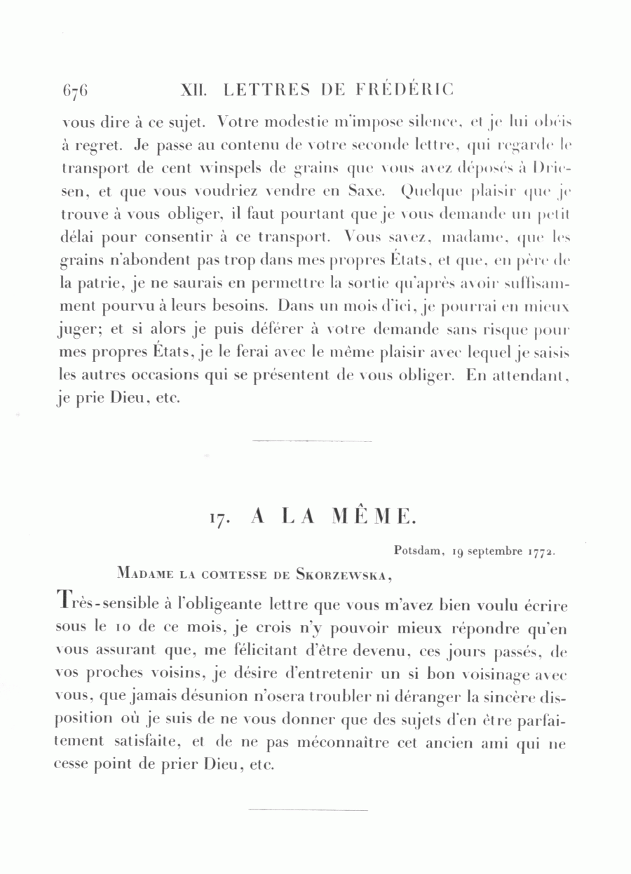 <676> vous dire à ce sujet. Votre modestie m'impose silence, et je lui obéis à regret. Je passe au contenu de votre seconde lettre, qui regarde le transport de cent winspels de grains que vous avez déposés à Driesen, et que vous voudriez vendre en Saxe. Quelque plaisir que je trouve à vous obliger, il faut pourtant que je vous demande un petit délai pour consentir à ce transport. Vous savez, madame, que les grains n'abondent pas trop dans mes propres Etats, et que, en père de la patrie, je ne saurais en permettre la sortie qu'après avoir suffisamment pourvu à leurs besoins. Dans un mois d'ici, je pourrai en mieux juger; et si alors je puis déférer à votre demande sans risque pommes propres États, je le ferai avec le même plaisir avec lequel je saisis les autres occasions qui se présentent de vous obliger. En attendant, je prie Dieu, etc.