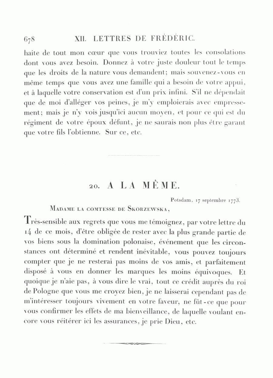 Très-sensible aux regrets que vous me témoignez, par votre lettre du 14 de ce mois, d'être obligée de rester avec la plus grande partie de vos biens sous la domination polonaise, événement que les circonstances ont déterminé et rendent inévitable, vous pouvez toujours compter que je ne resterai pas moins de vos amis, et parfaitement disposé à vous en donner les marques les moins équivoques. Et quoique je n'aie pas, à vous dire le vrai, tout ce crédit auprès du roi de Pologne que vous me croyez bien, je ne laisserai cependant pas de m'intéresser toujours vivement en votre faveur, ne fût-ce que pour vous confirmer les effets de ma bienveillance, de laquelle voulant encore vous réitérer ici les assurances, je prie Dieu, etc.
