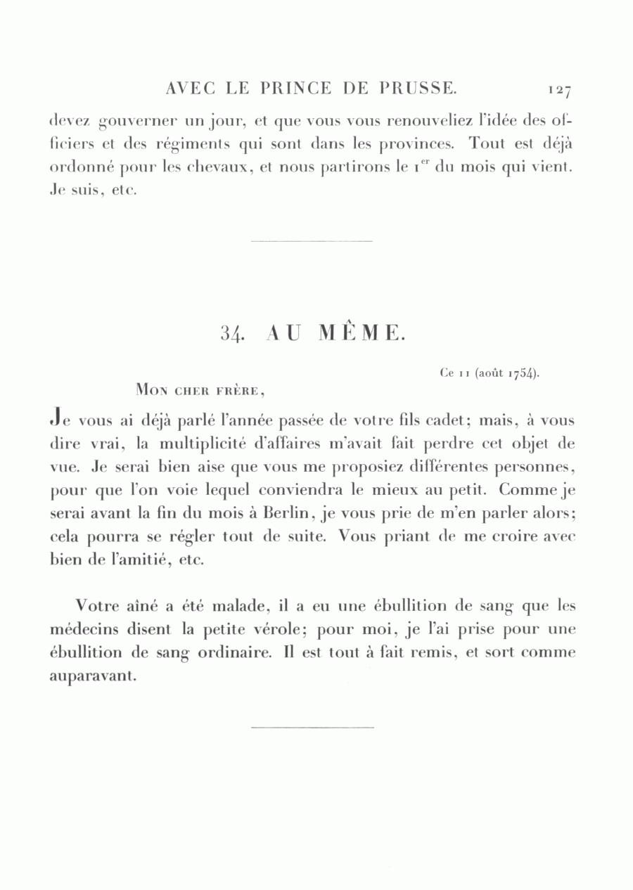 Je vous ai déjà parlé l'année passée de votre fils cadet; mais, à vous dire vrai, la multiplicité d'affaires m'avait fait perdre cet objet de vue. Je serai bien aise que vous me proposiez différentes personnes, pour que l'on voie lequel conviendra le mieux au petit. Comme je serai avant la fin du mois à Berlin, je vous prie de m'en parler alors; cela pourra se régler tout de suite. Vous priant de me croire avec bien de l'amitié, etc.