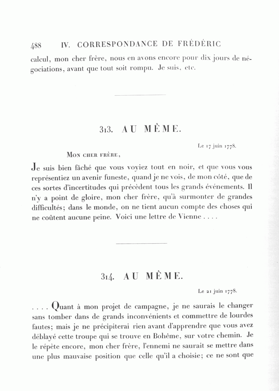 Je suis bien fâché que vous voyiez tout en noir, et que vous vous représentiez un avenir funeste, quand je ne vois, de mon côté, que de ces sortes d'incertitudes qui précèdent tous les grands événements. Il n'y a point de gloire, mon cher frère, qu'à surmonter de grandes difficultés; dans le monde, on ne tient aucun compte des choses qui ne coûtent aucune peine. Voici une lettre de Vienne ....