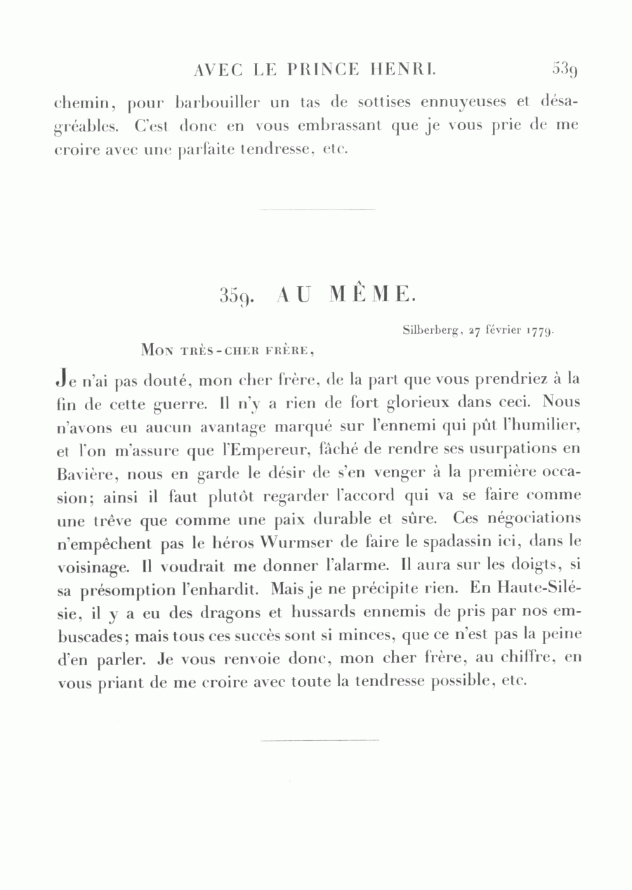 Je n'ai pas douté, mon cher frère, de la part que vous prendriez à la fin de celte guerre. Il n'y a rien de fort glorieux dans ceci. Nous n'avons eu aucun avantage marqué sur l'ennemi qui pût l'humilier, et l'on m'assure que l'Empereur, fâché de rendre ses usurpations en Bavière, nous en garde le désir de s'en venger à la première occasion; ainsi il faut plutôt regarder l'accord qui va se faire comme une trêve que comme une paix durable et sûre. Ces négociations n'empêchent pas le héros Wurmser de faire le spadassin ici, dans le voisinage. Il voudrait me donner l'alarme. Il aura sur les doigts, si sa présomption l'enhardit. Mais je ne précipite rien. En Haute-Silésie, il y a eu des dragons et hussards ennemis de pris par nos embuscades; mais tous ces succès sont si minces, que ce n'est pas la peine d'en parler. Je vous renvoie donc, mon cher frère, au chiffre, en vous priant de me croire avec toute la tendresse possible, etc.