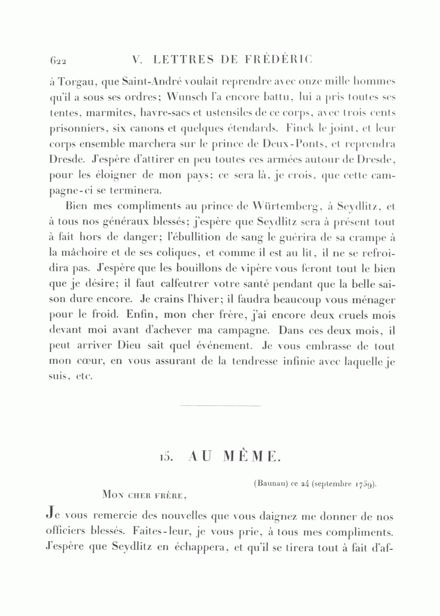Bien mes compliments au prince de Würtemberg, à Seydlitz, et à tous nos généraux blessés; j'espère que Seydlitz sera à présent tout à fait hors de danger; l'ébullition de sang le guérira de sa crampe à la mâchoire et de ses coliques, et comme il est au lit, il ne se refroidira pas. J'espère que les bouillons de vipère vous feront tout le bien que je désire; il faut calfeutrer votre santé pendant que la belle saison dure encore. Je crains l'hiver; il faudra beaucoup vous ménager pour le froid. Enfin, mon cher frère, j'ai encore deux cruels mois devant moi avant d'achever ma campagne. Dans ces deux mois, il peut arriver Dieu sait quel événement. Je vous embrasse de tout mon cœur, en vous assurant de la tendresse infinie avec laquelle je suis, etc.
