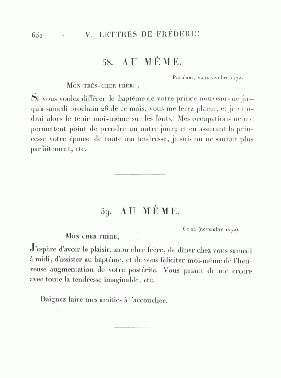 J'espère d'avoir le plaisir, mon cher frère, de dîner chez vous samedi à midi, d'assister au baptême, et de vous féliciter moi-même de l'heureuse augmentation de votre postérité. Vous priant de me croire avec toute la tendresse imaginable, etc.