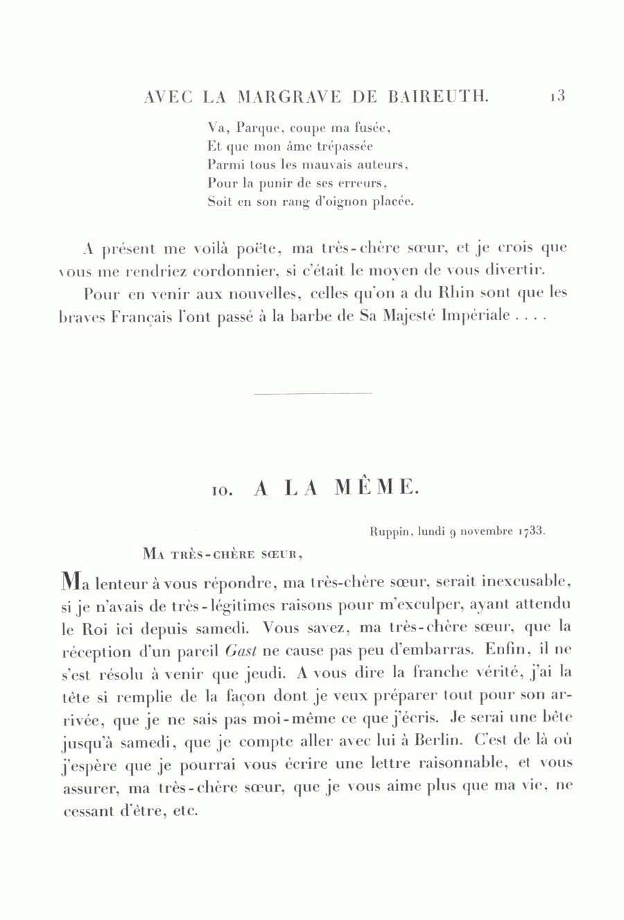 Ma lenteur à vous répondre, ma très-chère sœur, serait inexcusable, si je n'avais de très-légitimes raisons pour m'exculper, ayant attendu le Roi ici depuis samedi. Vous savez, ma très-chère sœur, que la réception d'un pareil Gast ne cause pas peu d'embarras. Enfin, il ne s'est résolu à venir que jeudi. A vous dire la franche vérité, j'ai la tête si remplie de la façon dont je veux préparer tout pour son arrivée, que je ne sais pas moi-même ce que j'écris. Je serai une bête jusqu'à samedi, que je compte aller avec lui à Berlin. C'est de là où j'espère que je pourrai vous écrire une lettre raisonnable, et vous assurer, ma très-chère sœur, que je vous aime plus que ma vie, ne cessant d'être, etc.