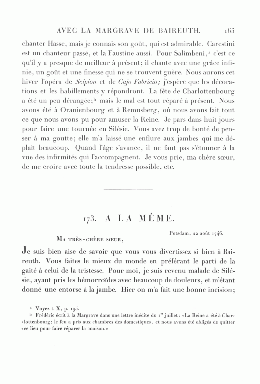 <165> chanter Hasse, mais je connais son goût, qui est admirable. Carestini est un chanteur passé, et la Faustine aussi. Pour Salimbeni,a c'est ce qu'il y a presque de meilleur à présent; il chante avec une grâce infinie, un goût et une finesse qui ne se trouvent guère. Nous aurons cet hiver l'opéra de Scipion et de Cajo Fabricio; j'espère que les décorations et les habillements y répondront. La fête de Charlottenbourg a été un peu dérangée;b mais le mal est tout réparé à présent. Nous avons été à Oranienbourg et à Remusberg, où nous avons fait tout ce que nous avons pu pour amuser la Reine. Je pars dans huit jours pour faire une tournée en Silésie. Vous avez trop de bonté de penser à ma goutte; elle m'a laissé une enflure aux jambes qui me déplaît beaucoup. Quand l'âge s'avance, il ne faut pas s'étonner à la vue des infirmités qui l'accompagnent. Je vous prie, ma chère sœur, de me croire avec toute la tendresse possible, etc.
