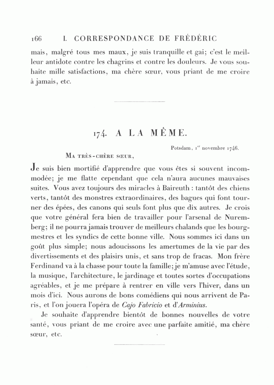 Je suis bien mortifié d'apprendre que vous êtes si souvent incommodée; je me flatte cependant que cela n'aura aucunes mauvaises suites. Vous avez toujours des miracles à Baireuth : tantôt des chiens verts, tantôt des monstres extraordinaires, des bagues qui font tourner des épées, des canons qui seuls font plus que dix autres. Je crois que votre général fera bien de travailler pour l'arsenal de Nuremberg; il ne pourra jamais trouver de meilleurs chalands que les bourgmestres et les syndics de cette bonne ville. Nous sommes ici dans un goût plus simple; nous adoucissons les amertumes de la vie par des divertissements et des plaisirs unis, et sans trop de fracas. Mon frère Ferdinand va à la chasse pour toute la famille; je m'amuse avec l'étude, la musique, l'architecture, le jardinage et toutes sortes d'occupations agréables, et je me prépare à rentrer en ville vers l'hiver, dans un mois d'ici. Nous aurons de bons comédiens qui nous arrivent de Paris, et l'on jouera l'opéra de Cajo Fabricio et d'Arminius.