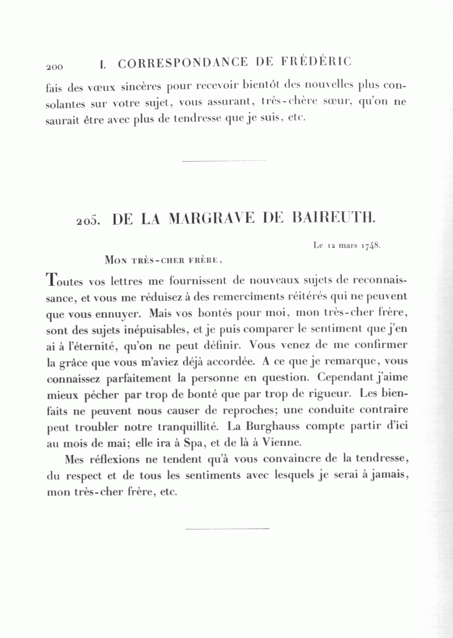 Toutes vos lettres me fournissent de nouveaux sujets de reconnaissance, et vous me réduisez à des remercîments réitérés qui ne peuvent que vous ennuyer. Mais vos bontés pour moi, mon très-cher frère, sont des sujets inépuisables, et je puis comparer le sentiment que j'en ai à l'éternité, qu'on ne peut définir. Vous venez de me confirmer la grâce que vous m'aviez déjà accordée. A ce que je remarque, vous connaissez parfaitement la personne en question. Cependant j'aime mieux pécher par trop de bonté que par trop de rigueur. Les bienfaits ne peuvent nous causer de reproches; une conduite contraire peut troubler notre tranquillité. La Burghauss compte partir d'ici au mois de mai; elle ira à Spa, et de là à Vienne.