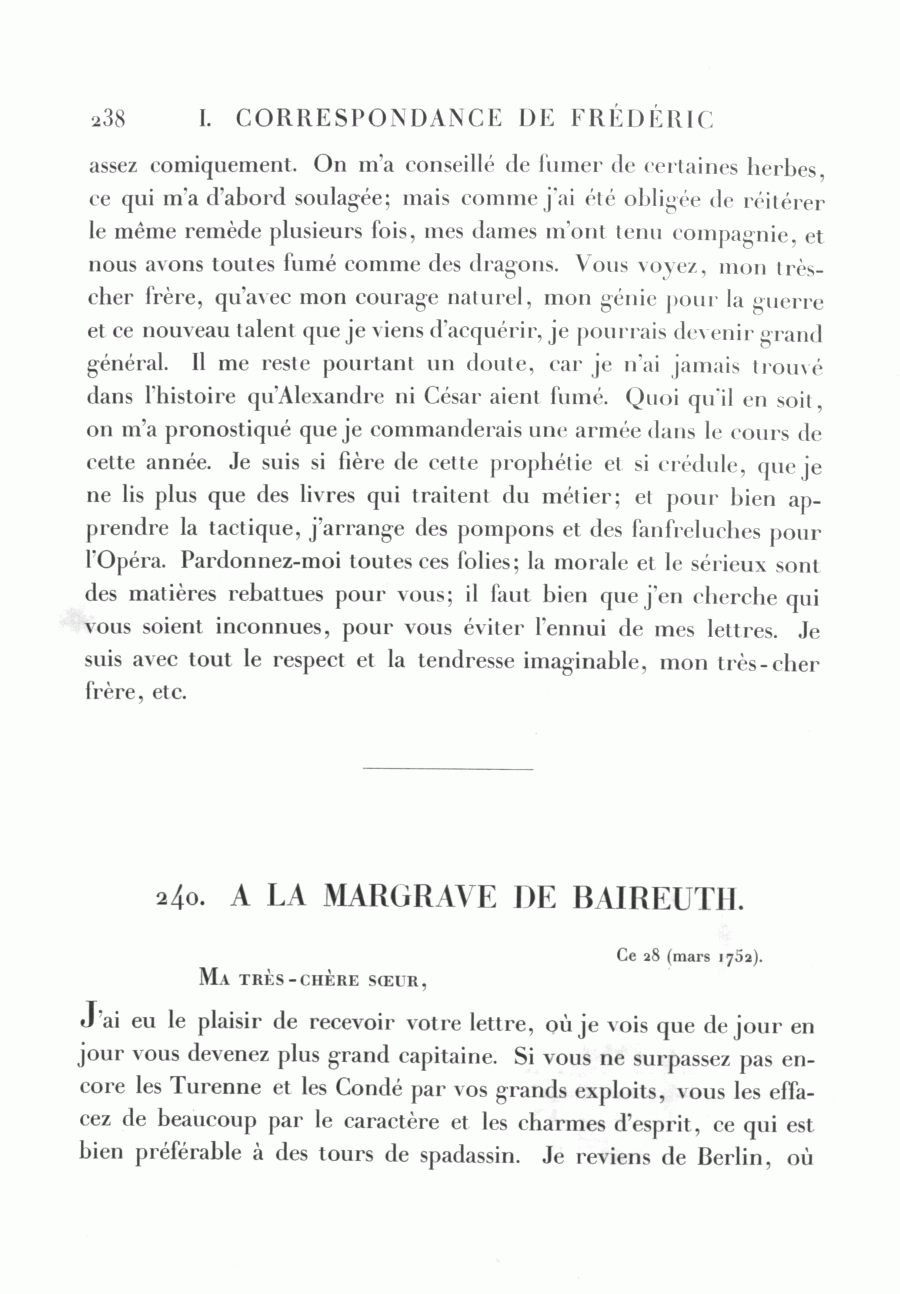 J'ai eu le plaisir de recevoir votre lettre, où je vois que de jour en jour vous devenez plus grand capitaine. Si vous ne surpassez pas encore les Turenne et les Condé par vos grands exploits, vous les effacez de beaucoup par le caractère et les charmes d'esprit, ce qui est bien préférable à des tours de spadassin. Je reviens de Berlin, où