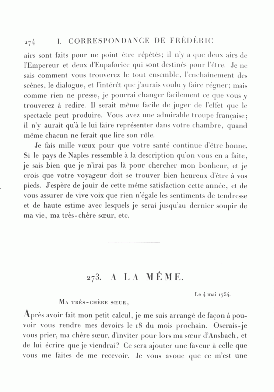 <274> airs sont faits pour ne point être répétés; il n'y a que deux airs de l'Empereur et deux d'Eupaforice qui sont destinés pour l'être. Je ne sais comment vous trouverez le tout ensemble, l'enchaînement des scènes, le dialogue, et l'intérêt que j'aurais voulu y faire régner; mais comme rien ne presse, je pourrai changer facilement ce que vous y trouverez à redire. Il serait même facile de juger de l'effet que le spectacle peut produire. Vous avez une admirable troupe française; il n'y aurait qu'à le lui faire représenter dans votre chambre, quand même chacun ne ferait que lire son rôle.