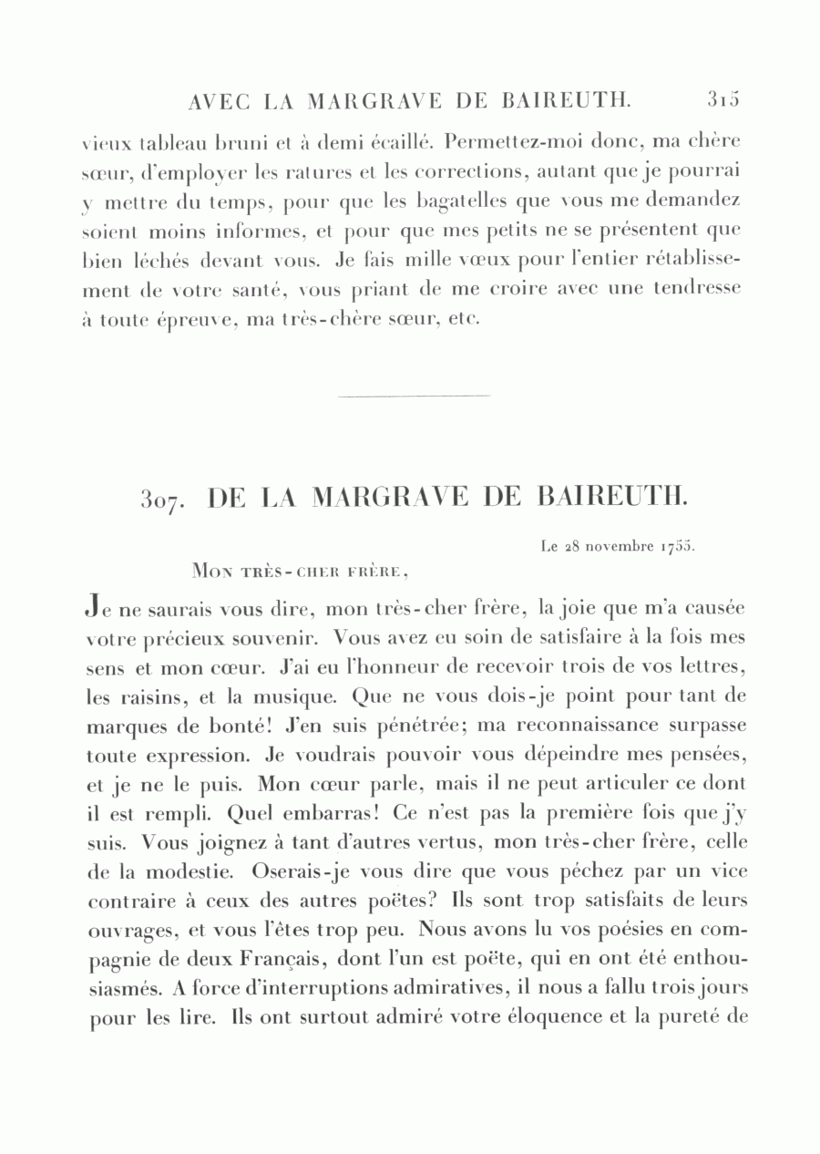 Je ne saurais vous dire, mon très-cher frère, la joie que m'a causée votre précieux souvenir. Vous avez eu soin de satisfaire à la fois mes sens et mon cœur. J'ai eu l'honneur de recevoir trois de vos lettres, les raisins, et la musique. Que ne vous dois-je point pour tant de marques de bonté! J'en suis pénétrée; ma reconnaissance surpasse toute expression. Je voudrais pouvoir vous dépeindre mes pensées, et je ne le puis. Mon cœur parle, mais il ne peut articuler ce dont il est rempli. Quel embarras! Ce n'est pas la première fois que j'y suis. Vous joignez à tant d'autres vertus, mon très-cher frère, celle de la modestie. Oserais-je vous dire que vous péchez par un vice contraire à ceux des autres poëtes? Ils sont trop satisfaits de leurs ouvrages, et vous l'êtes trop peu. Nous avons lu vos poésies en compagnie de deux Français, dont l'un est poëte, qui en ont été enthousiasmes. A force d'interruptions admiratives, il nous a fallu trois jours pour les lire. Ils ont surtout admiré votre éloquence et la pureté de