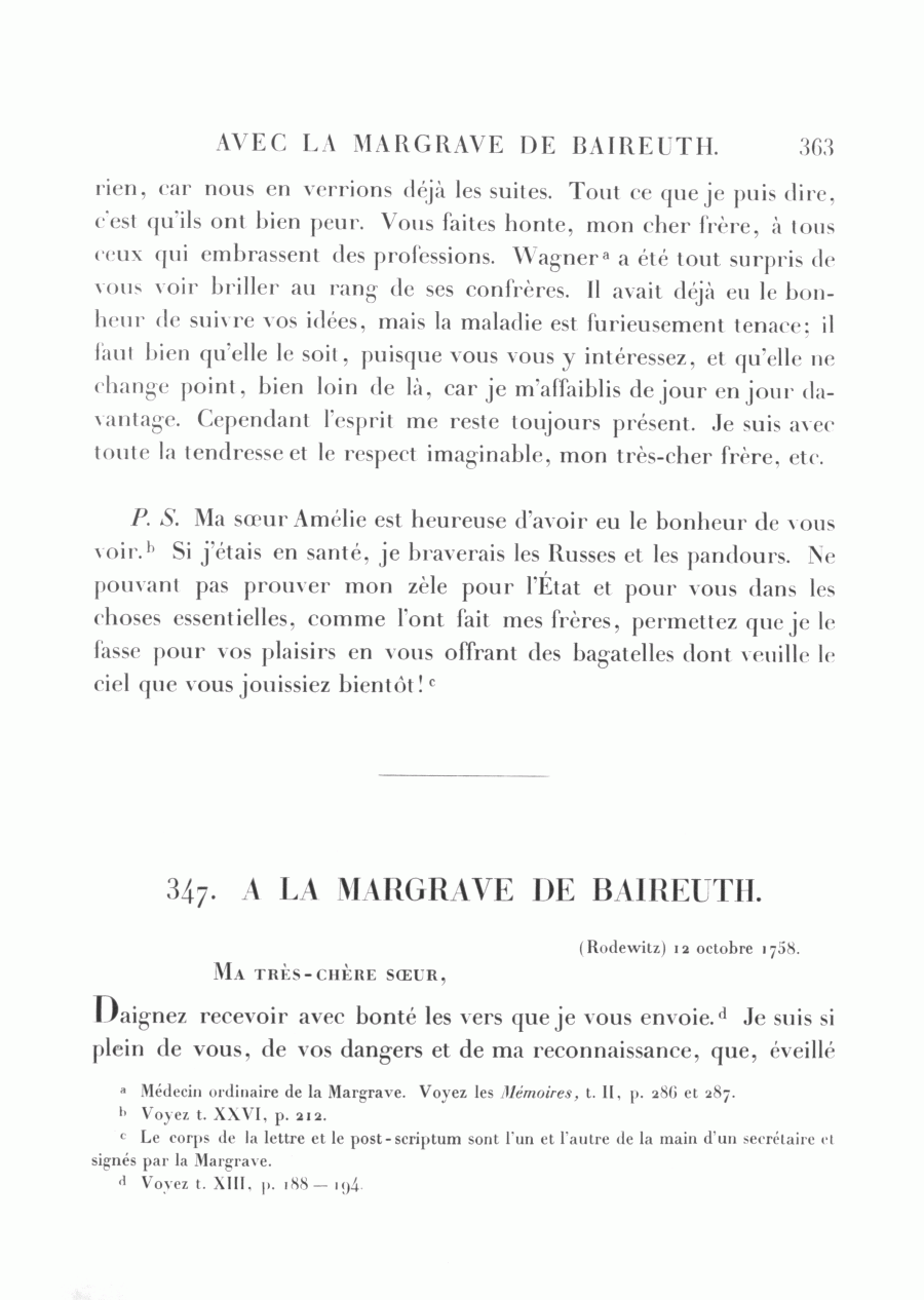 P. S. Ma sœur Amélie est heureuse d'avoir eu le bonheur de vous voir.b Si j'étais en santé, je braverais les Russes et les pandours. Ne pouvant pas prouver mon zèle pour l'Etat et pour vous dans les choses essentielles, comme l'ont fait mes frères, permettez que je le fasse pour vos plaisirs en vous offrant des bagatelles dont veuille le ciel que vous jouissiez bientôt!c