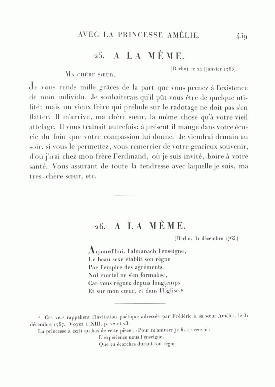 Je vous rends mille grâces de la part que vous prenez à l'existence de mon individu. Je souhaiterais qu'il pût vous être de quelque utilité; mais un vieux frère qui prélude sur le radotage ne doit pas s'en flatter. Il m'arrive, ma chère sœur, la même chose qu'à votre vieil attelage. Il vous traînait autrefois; à présent il mange dans votre écurie du foin que votre compassion lui donne. Je viendrai demain au soir, si vous le permettez, vous remercier de votre gracieux souvenir, d'où j'irai chez mon frère Ferdinand, où je suis invité, boire à votre santé. Vous assurant de toute la tendresse avec laquelle je suis, ma très-chère sœur, etc.