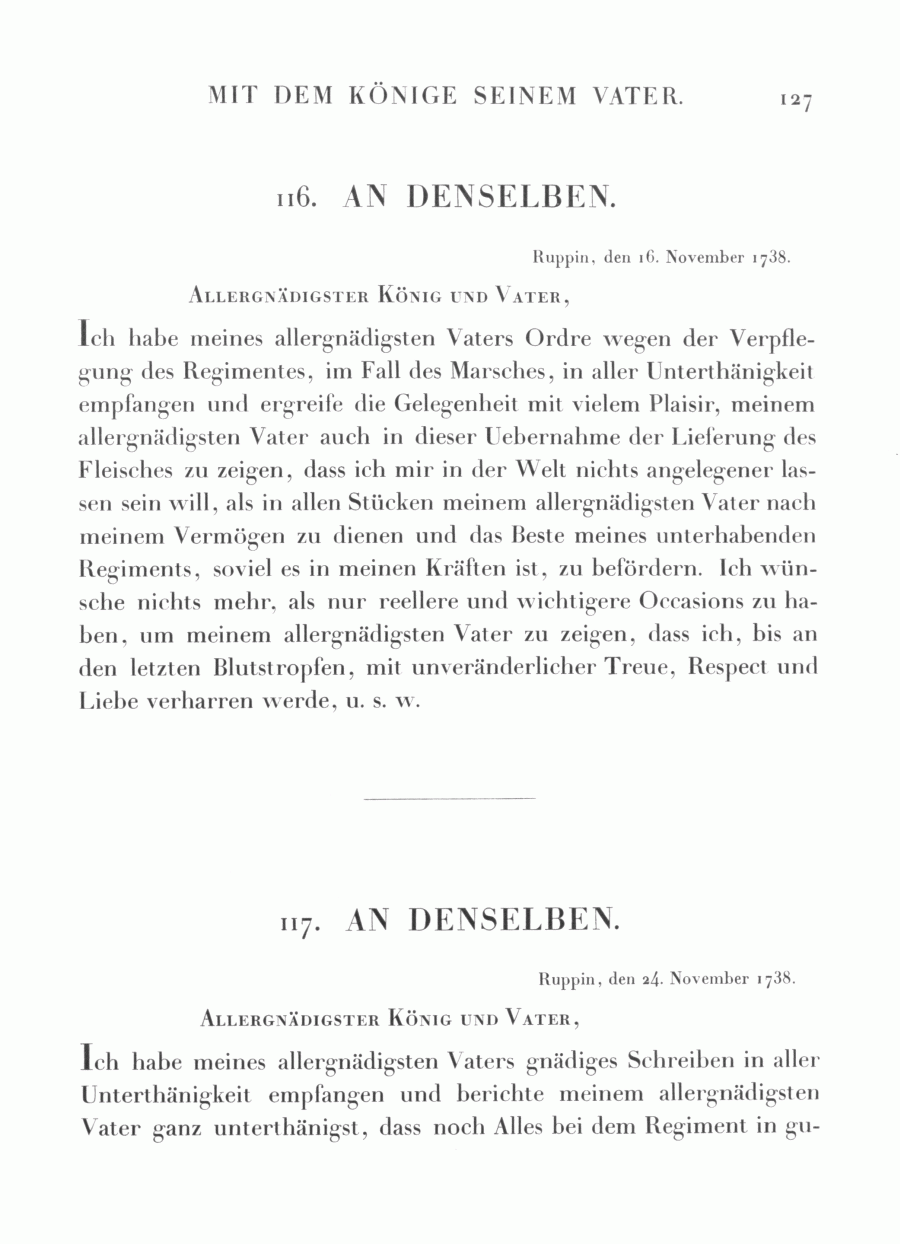Ich habe meines allergnädigsten Vaters Ordre wegen der Verpflegung des Regimentes, im Fall des Marsches, in aller Unterthänigkeit empfangen und ergreife die Gelegenheit mit vielem Plaisir, meinem allergnädigsten Vater auch in dieser Uebernahme der Lieferung des Fleisches zu zeigen, dass ich mir in der Welt nichts angelegener lassen sein will, als in allen Stücken meinem allergnädigsten Vater nach meinem Vermögen zu dienen und das Beste meines unterhabenden Regiments, soviel es in meinen Kräften ist, zu befördern. Ich wünsche nichts mehr, als nur reellere und wichtigere Occasions zu haben, um meinem allergnädigsten Vater zu zeigen, dass ich, bis an den letzten Blutstropfen, mit unveränderlicher Treue, Respect und Liebe verharren werde, u. s. w.