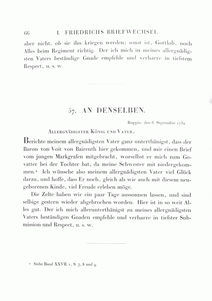 Berichte meinem allergnädigsten Vater ganz unterthänigst, dass der Baron von Voit von Baireuth hier gekommen, und mir einen Brief vom jungen Markgrafen mitgebracht, worselbst er mich zum Gevatter bei der Tochter bat, da meine Schwester mit niedergekommen.a Ich wünsche also meinem allergnädigsten Vater viel Glück darzu, und hoffe, dass Er noch, gleich als wie auch mit diesem neugeborenen Kinde, viel Freude erleben möge.