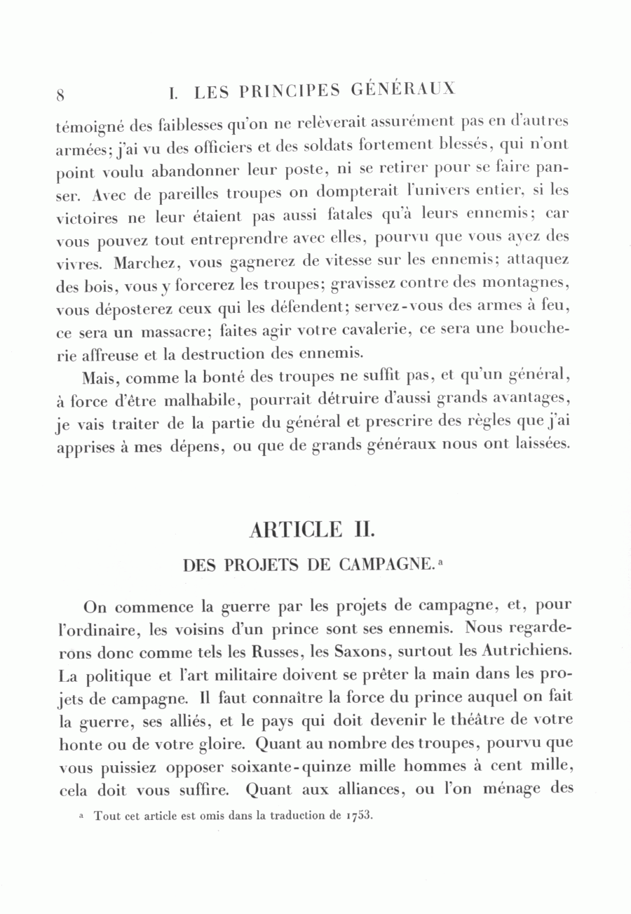Mais, comme la bonté des troupes ne suffit pas, et qu'un général, à force d'être malhabile, pourrait détruire d'aussi grands avantages, je vais traiter de la partie du général et prescrire des règles que j'ai apprises à mes dépens, ou que de grands généraux nous ont laissées.