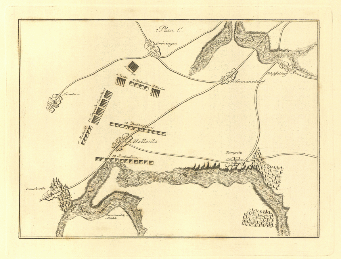Plan C. Gröningen5. Esq. Huss. Hermansdorf SchüsseldorfHeindern 5. Esq. Cav. 4. Bataillons 5. Esq. Cav.5. Batail. 20. Esquadr. Cavalerie12. BataillonsMollwitz12. Bataillons PampitzLauchwitzLauchwitz Mühle