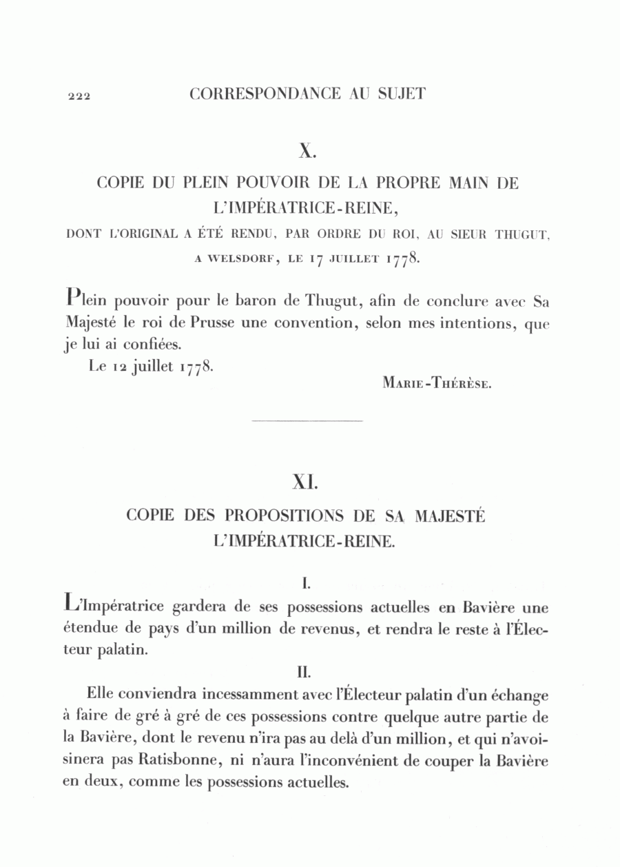 X. COPIE DU PLEIN POUVOIR DE LA PROPRE MAIN DE L'IMPÉRATRICE-REINE, DONT L'ORIGINAL A ÉTÉ RENDU, PAR ORDRE DU ROI, AU SIEUR THUGUT, A WELSDORF, LE 17 JUILLET 1778.