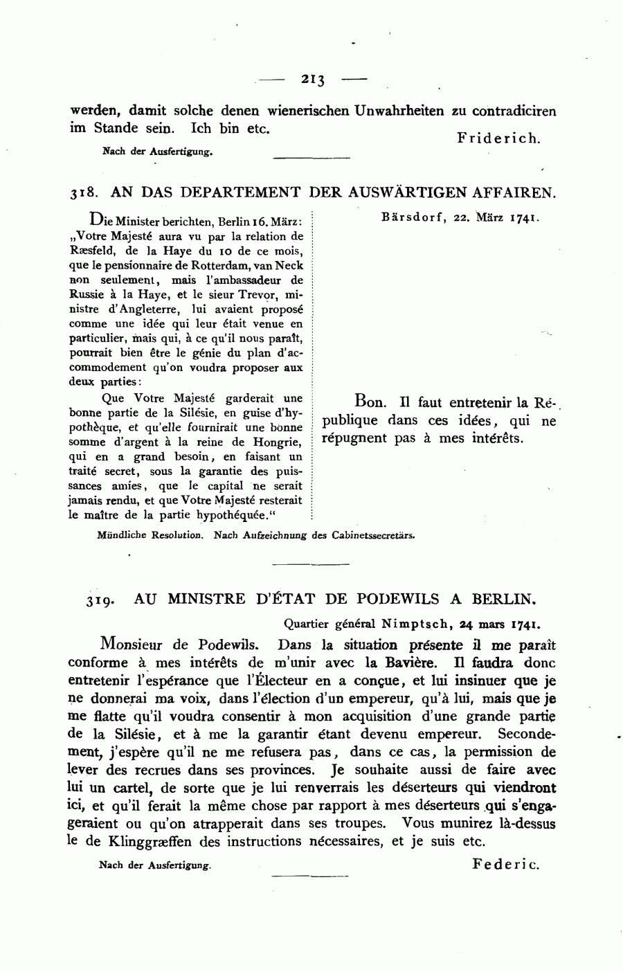 Die Minister berichten, Berlin 16. März: „Votre Majesté aura vu par la relation de Ræsfeld, de la Haye du 10 de ce mois, que le pensionnaire de Rotterdam, van Neck non seulement, mais l'ambassadeur de Russie à la Haye, et le sieur Trevor, ministre d'Angleterre, lui avaient proposé comme une idée qui leur était venue en particulier, mais qui, à ce qu'il nous paraît, pourrait bien être le génie du plan d'accommodement qu'on voudra proposer aux deux parties: | Bärsdorf, 22. März 1741. |