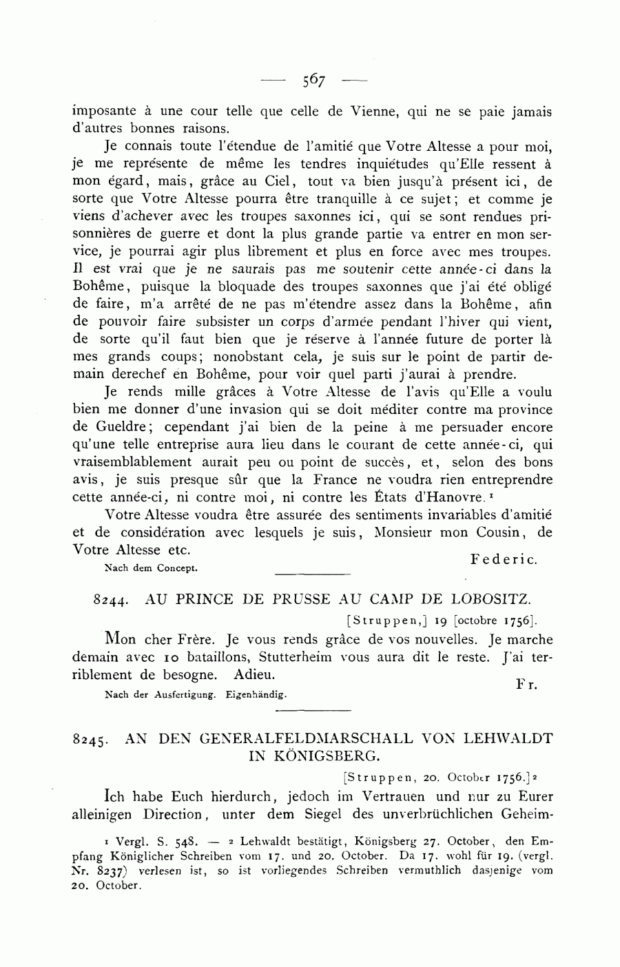 8245. An den Generalfeldmarschall von Lehwaldt in Königsberg